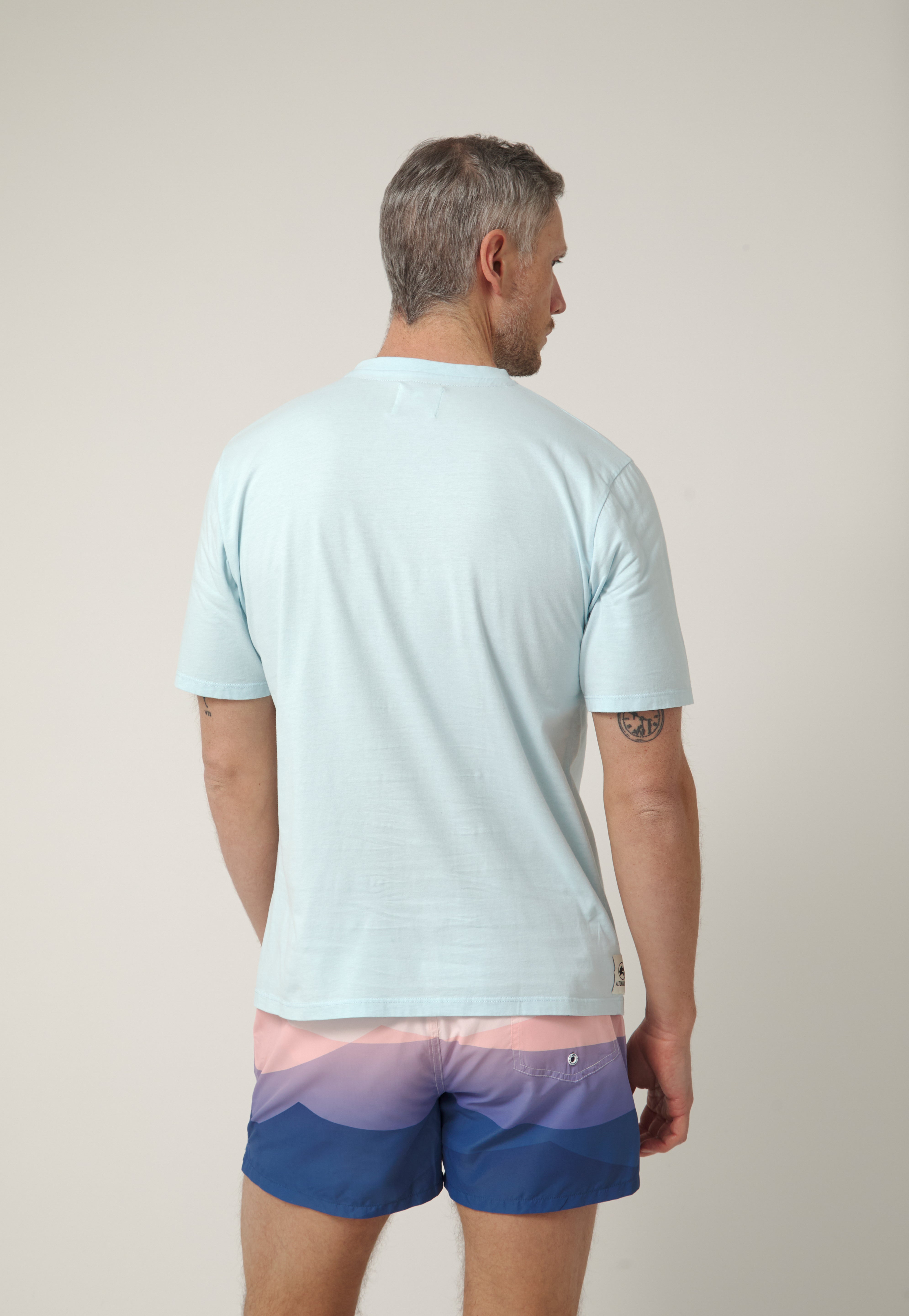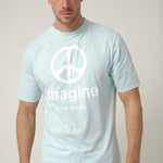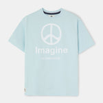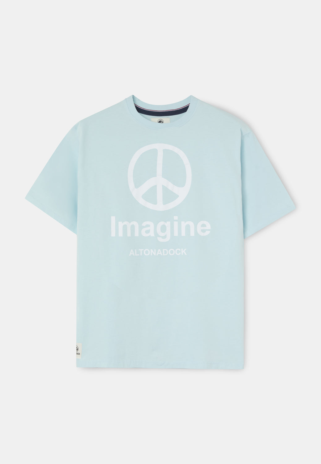 Camiseta de manga corta en tono azul cielo, diseñada para transmitir ligereza y optimismo en el día a día. Su diseño frontal con símbolo de paz y tipografía “Imagine” refuerza un mensaje positivo y actual, aportando personalidad a una prenda básica y fácil de llevar.