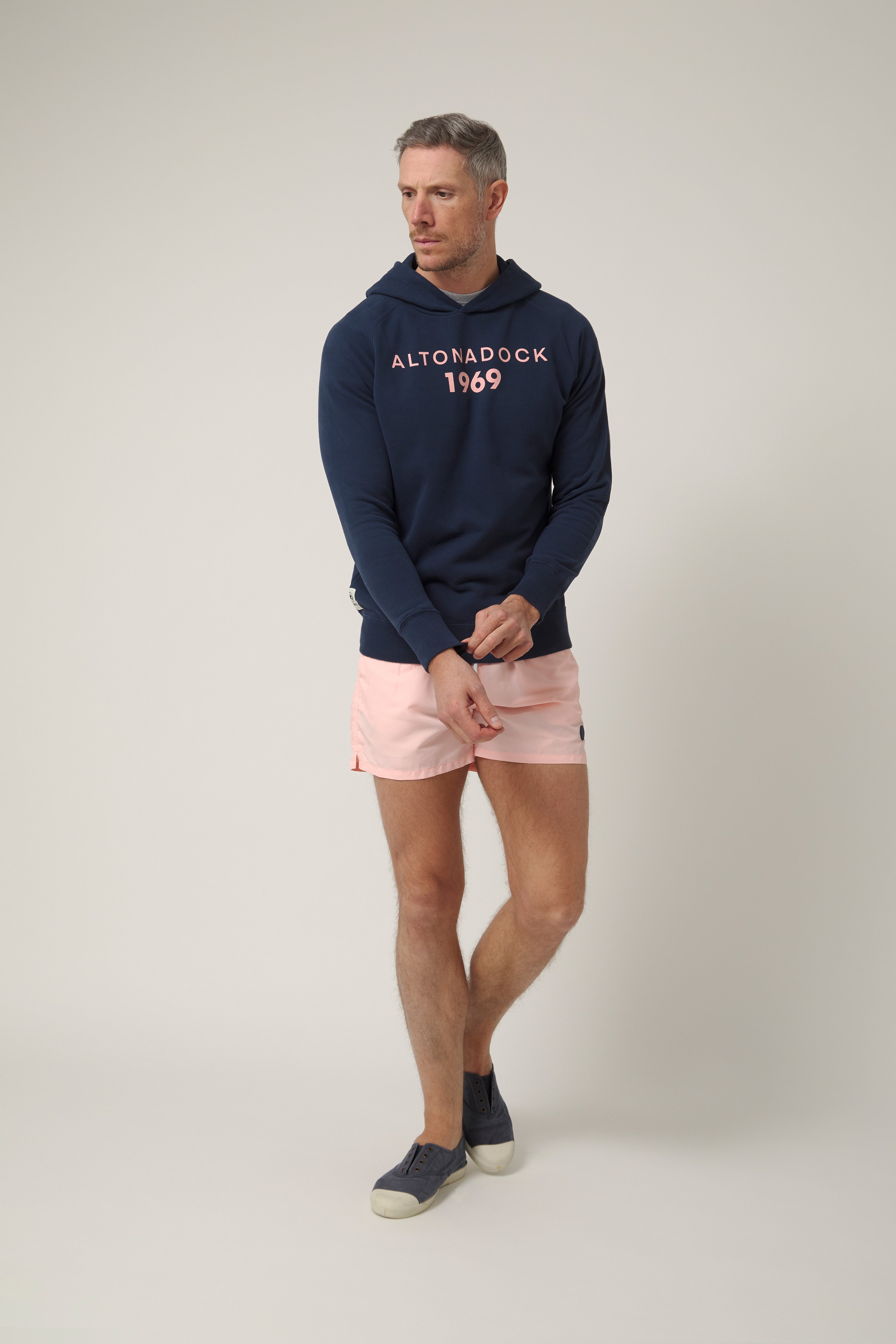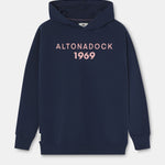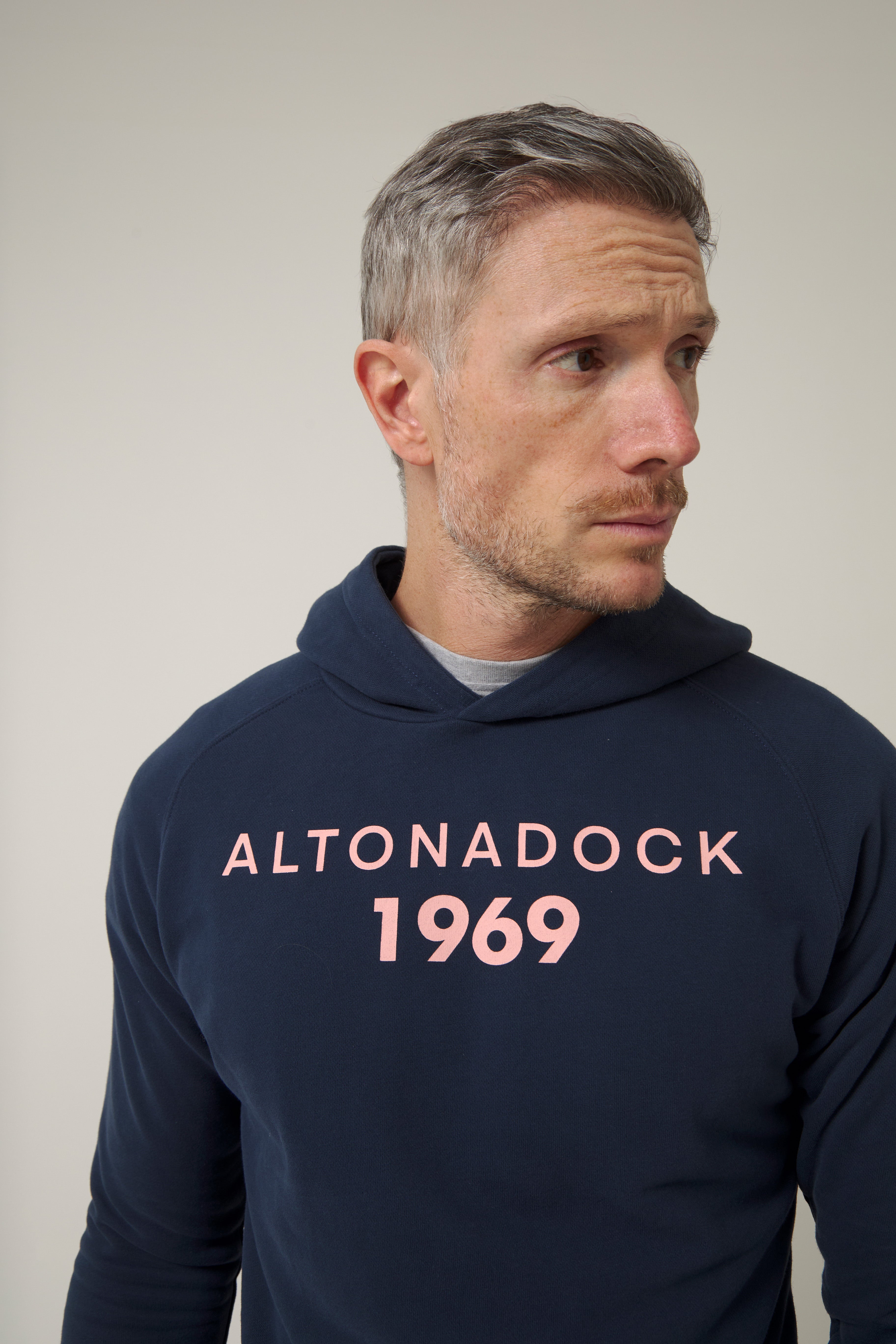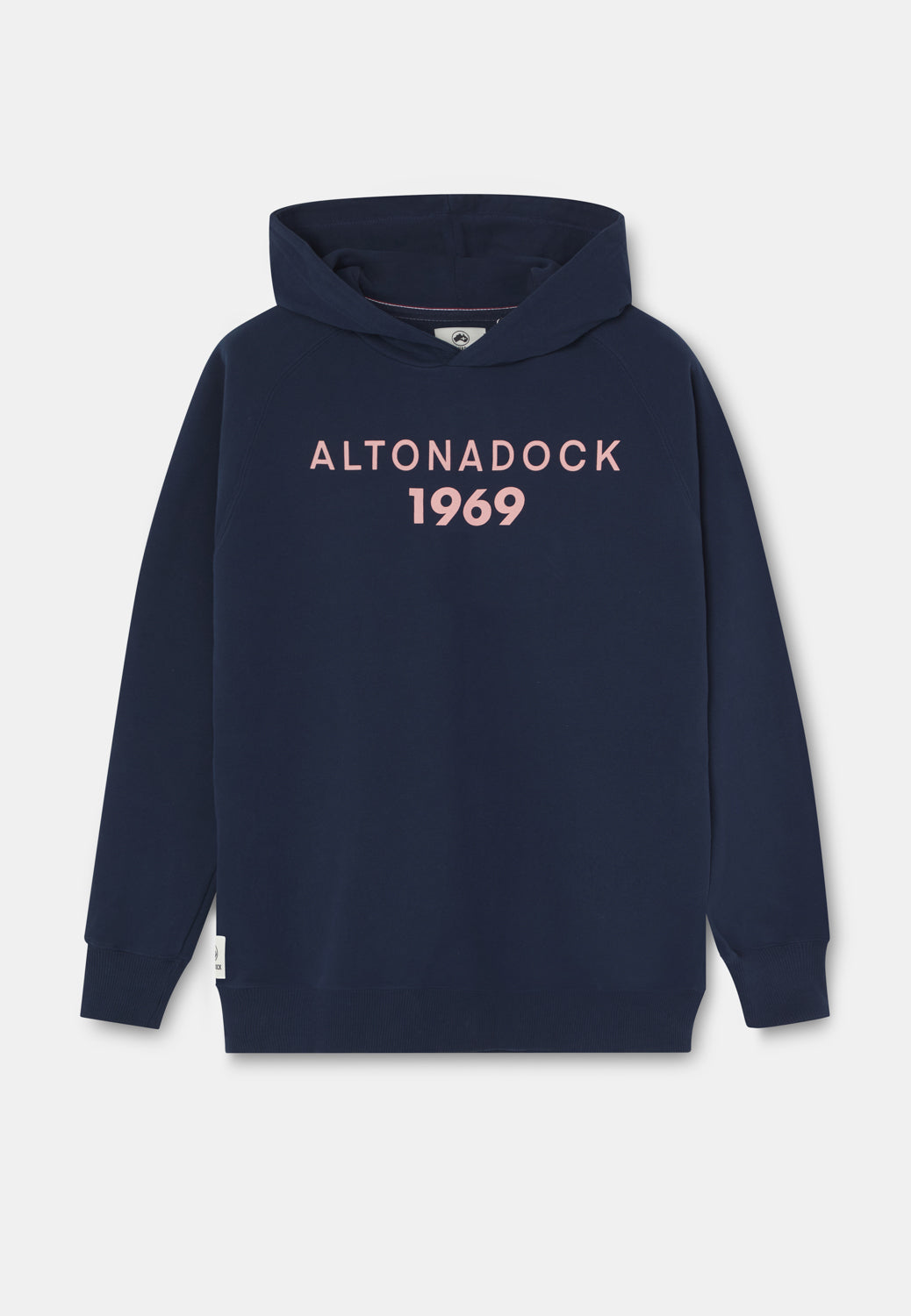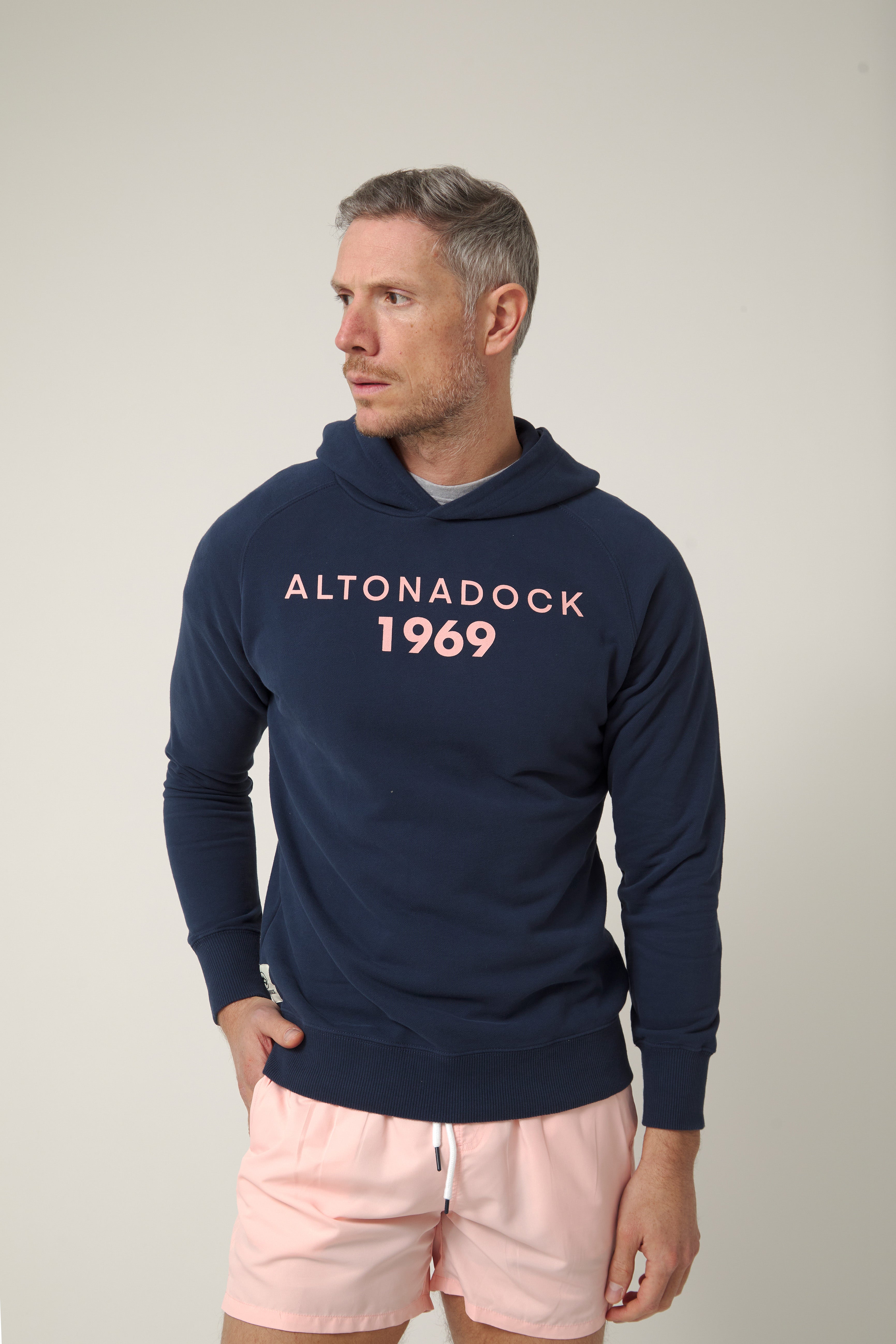 Sudadera con capucha en color azul navy con gráfico frontal “Altonadock 1969”, una prenda que rinde homenaje a los orígenes y la historia de la marca. Confeccionada en tejido de algodón de alta calidad, ofrece un tacto suave y una comodidad pensada para el uso diario. Su diseño limpio y equilibrado se combina con una tipografía clásica en contraste, aportando carácter sin perder versatilidad. Una sudadera atemporal, ideal para acompañarte temporada tras temporada en looks relajados y auténticos.