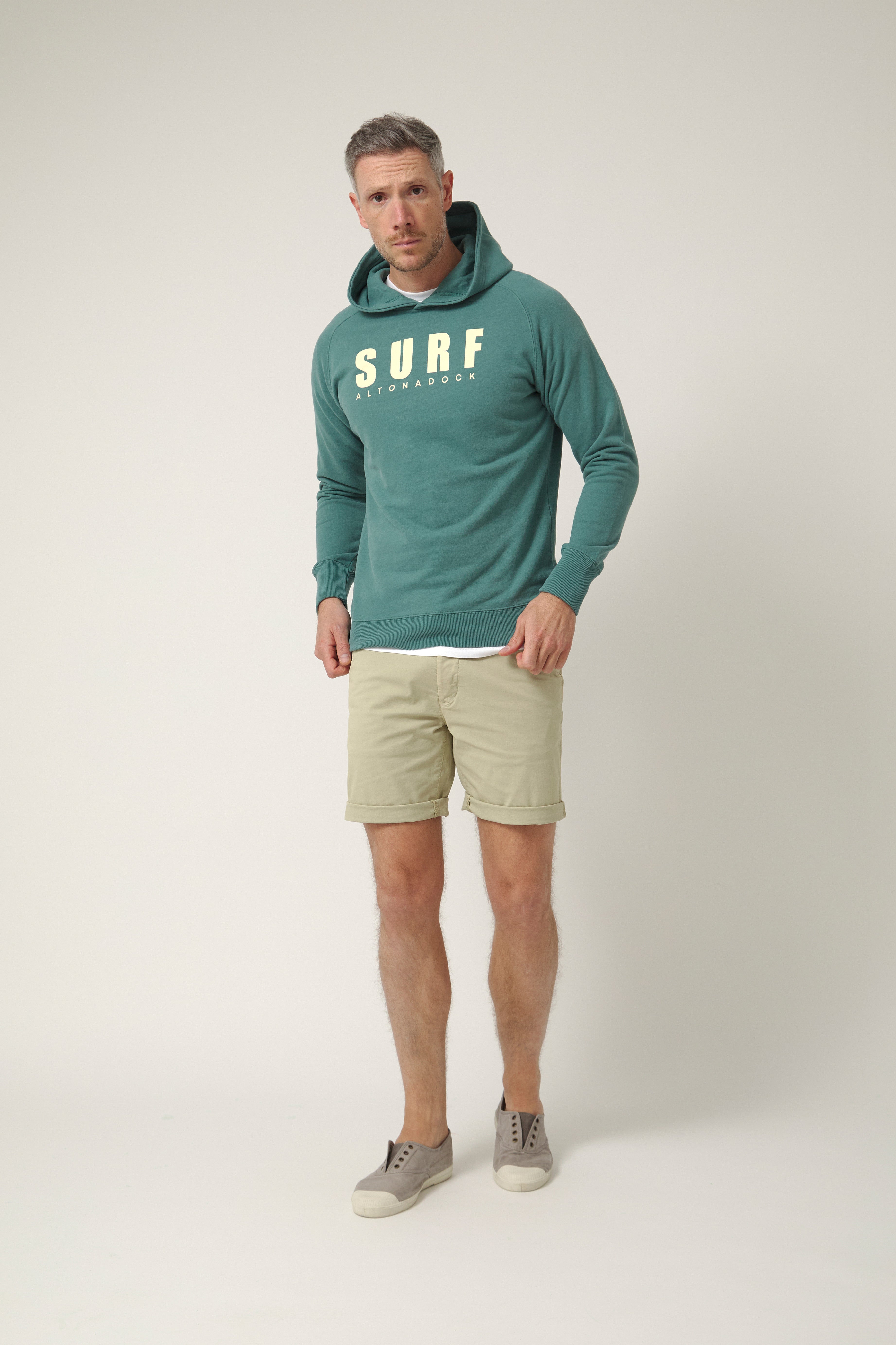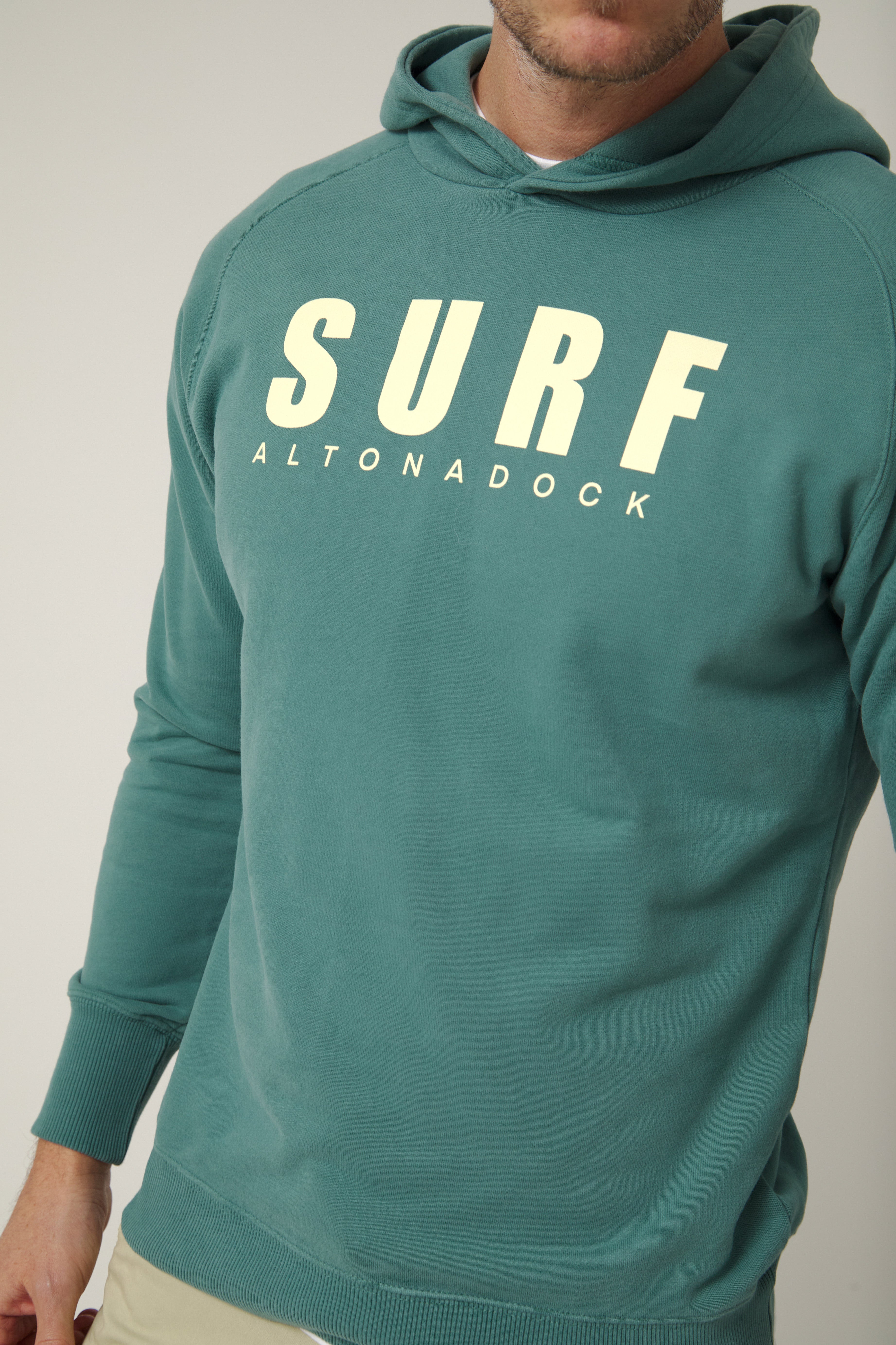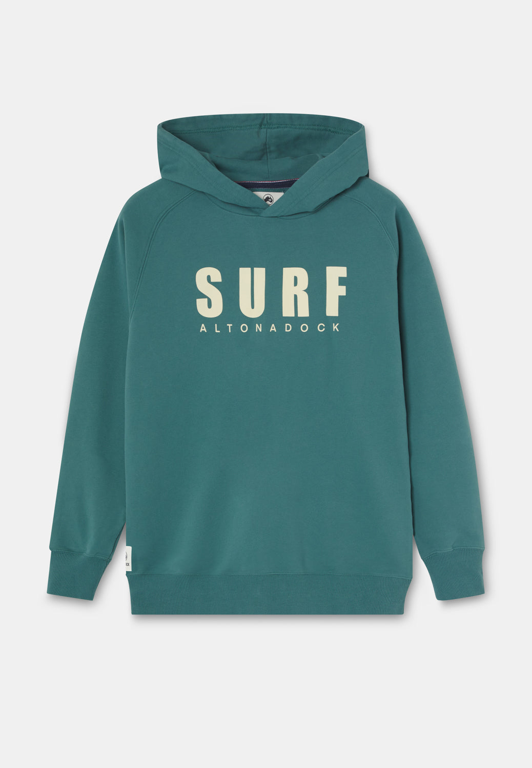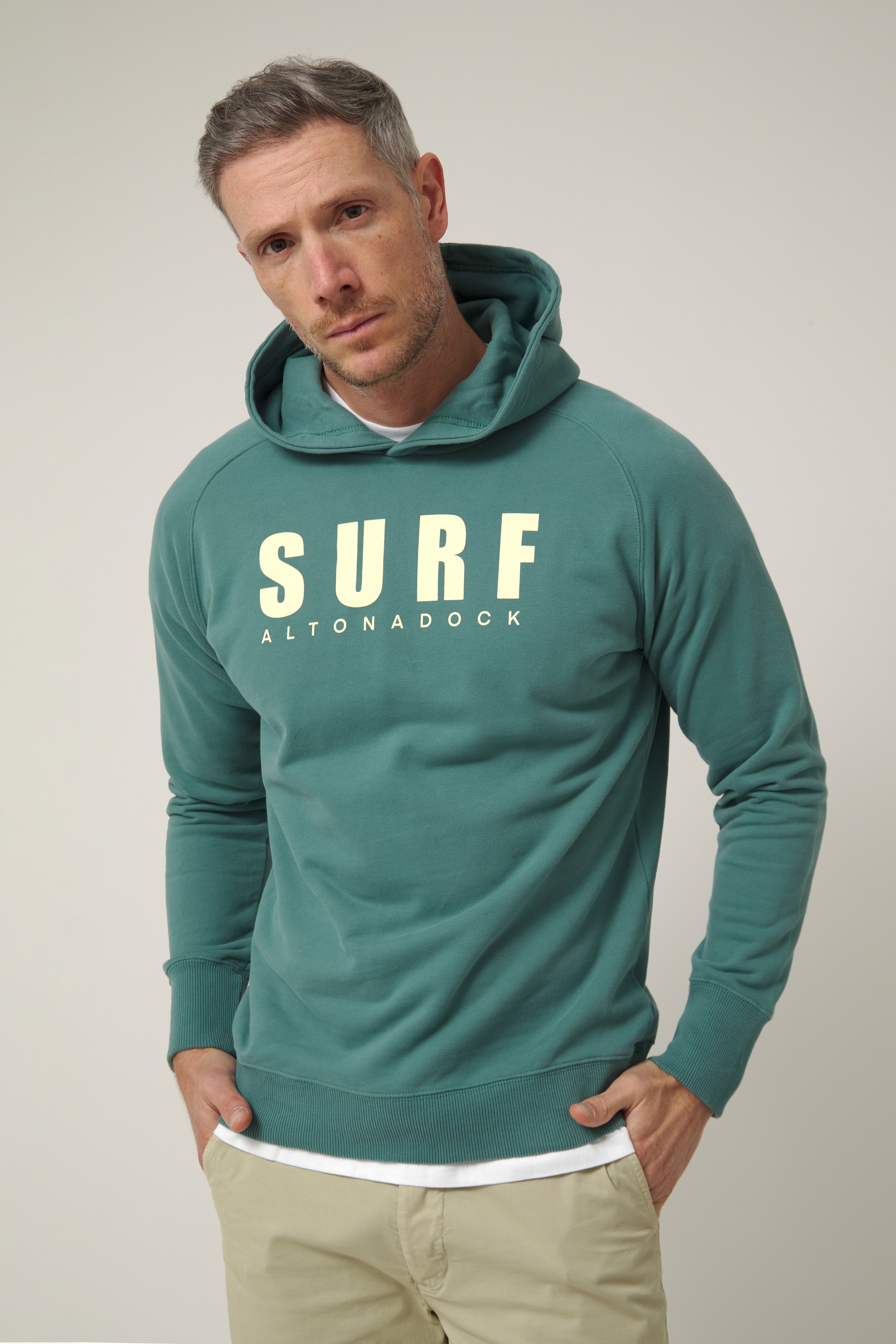 Sudadera con capucha en color verde teal con gráfico frontal “Surf Altonadock”, una prenda que transmite una actitud libre y un espíritu ligado al mar y a los días sin prisas. Confeccionada en tejido de algodón de alta calidad, ofrece un tacto suave y una comodidad ideal para el uso diario. Su diseño limpio se equilibra con una tipografía contundente y atemporal, aportando personalidad sin perder versatilidad. Una sudadera pensada para acompañarte dentro y fuera del agua, perfecta para looks relajados con identidad propia.
