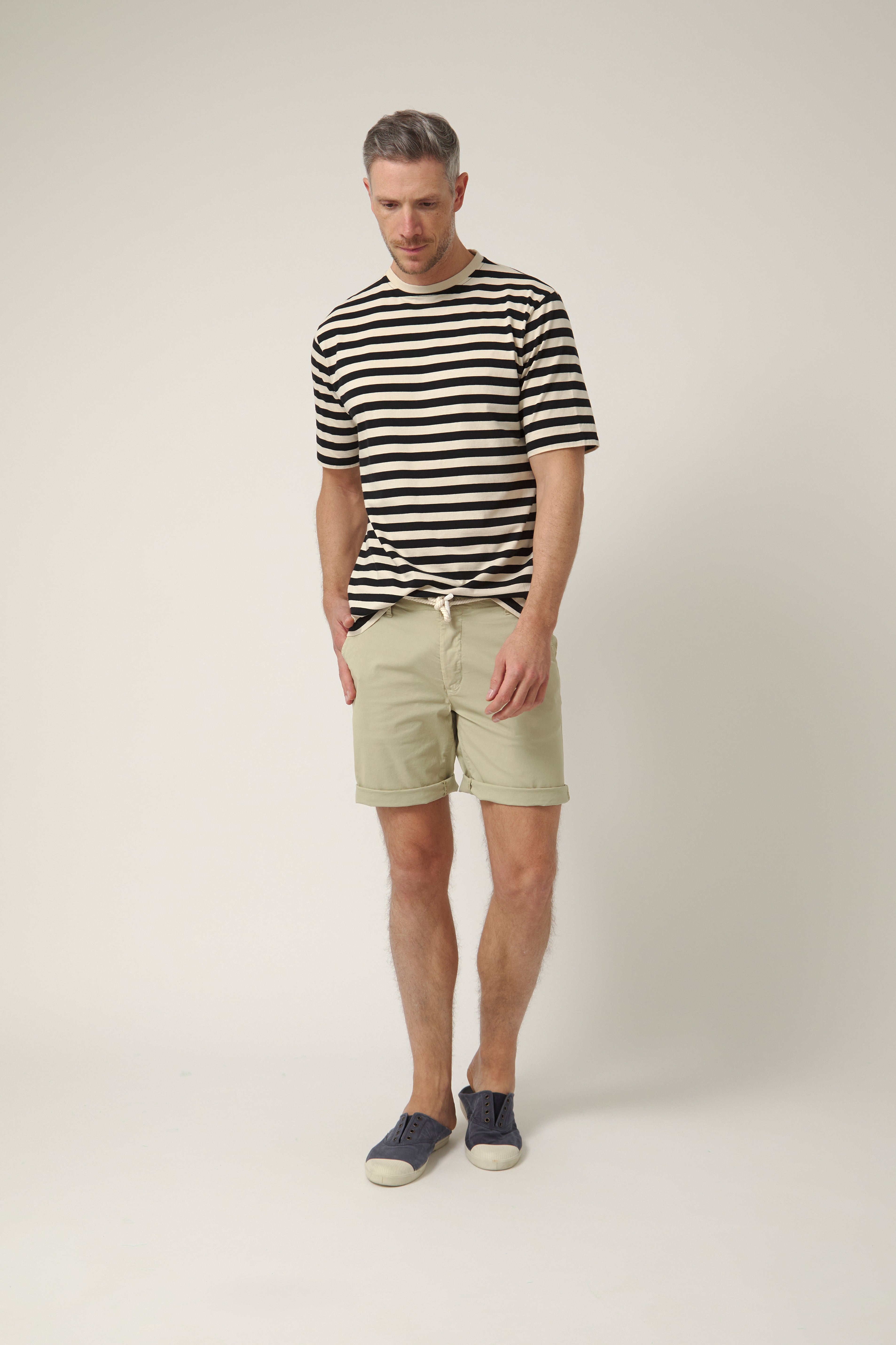 Bermuda en tono beige, ligera y cómoda para el día a día. Confeccionada en 98% algodón y 2% elastano, ofrece transpirabilidad y libertad de movimiento. Corte regular, con cierre de botón y cremallera, trabillas para cinturón y cordón ajustable en la cintura para mayor comodidad. Bolsillos laterales que aportan funcionalidad sin perder estilo.