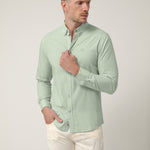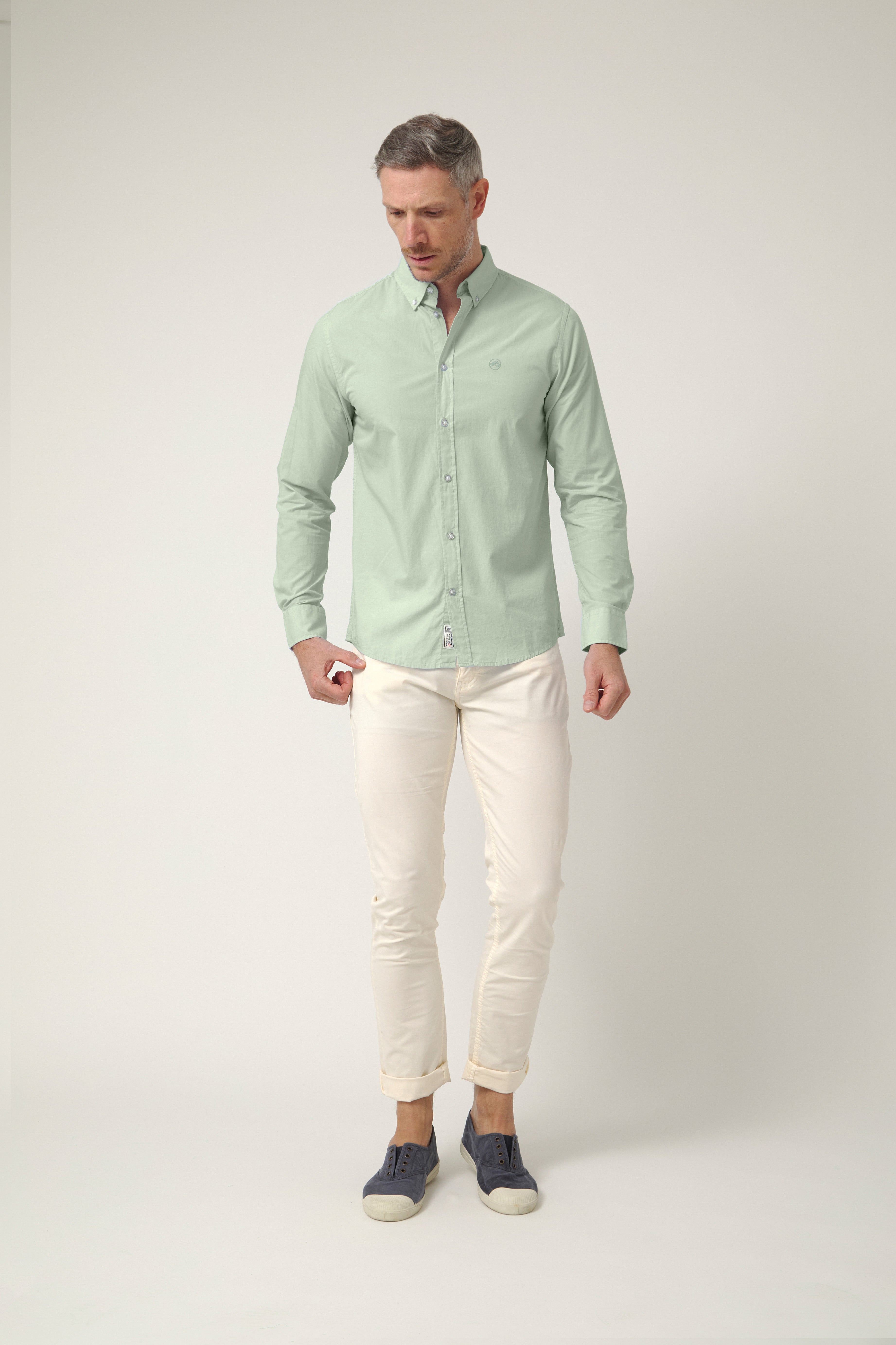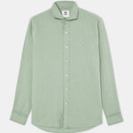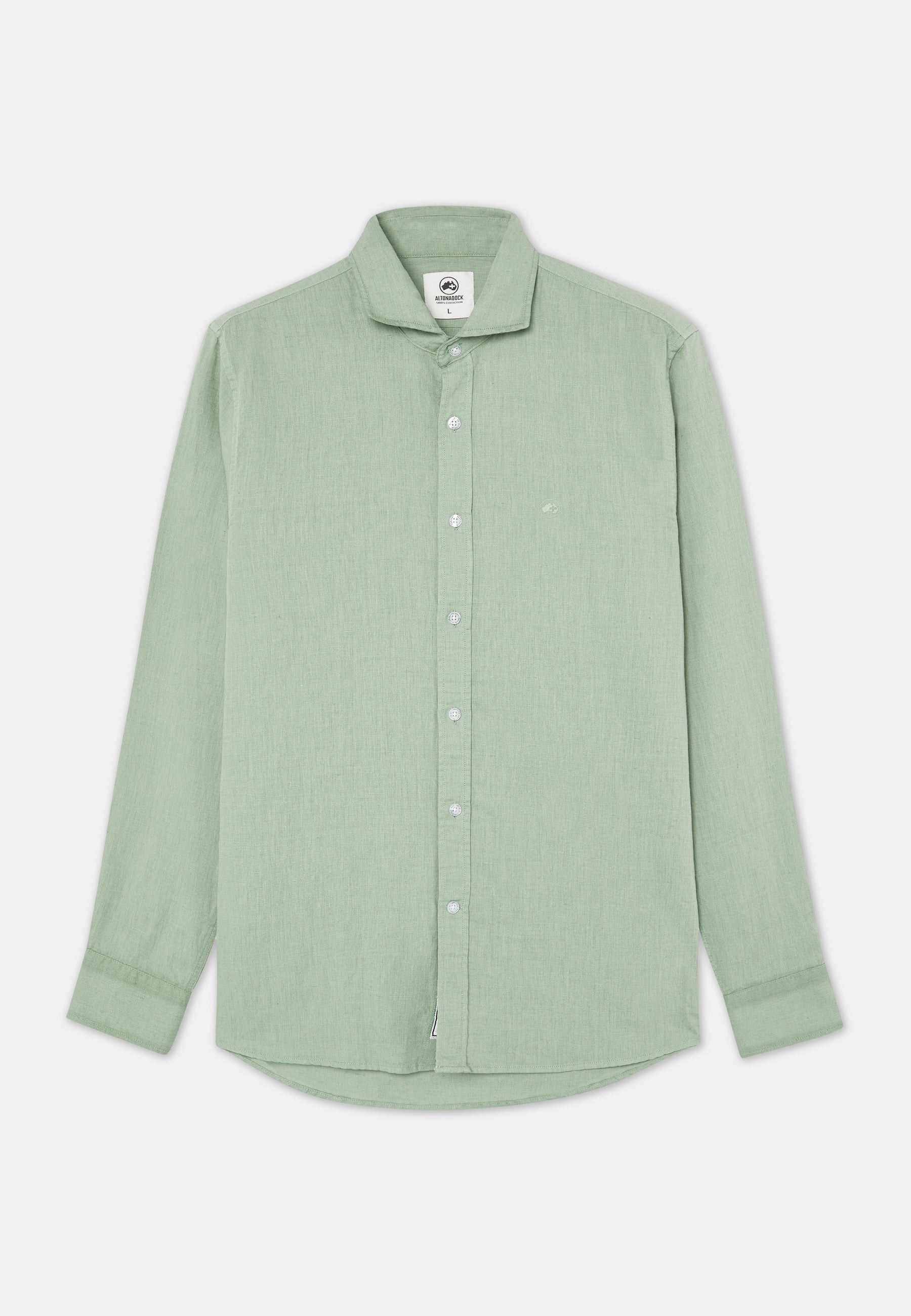 Camisa de lino en tono verde suave, inspirada en los paisajes del norte y en la calma de la costa a primera hora del día. Su diseño limpio, con cuello clásico y cierre frontal de botones, pone en valor la textura natural del tejido y un color que remite a la vegetación cercana al mar y a la luz filtrada por la bruma.