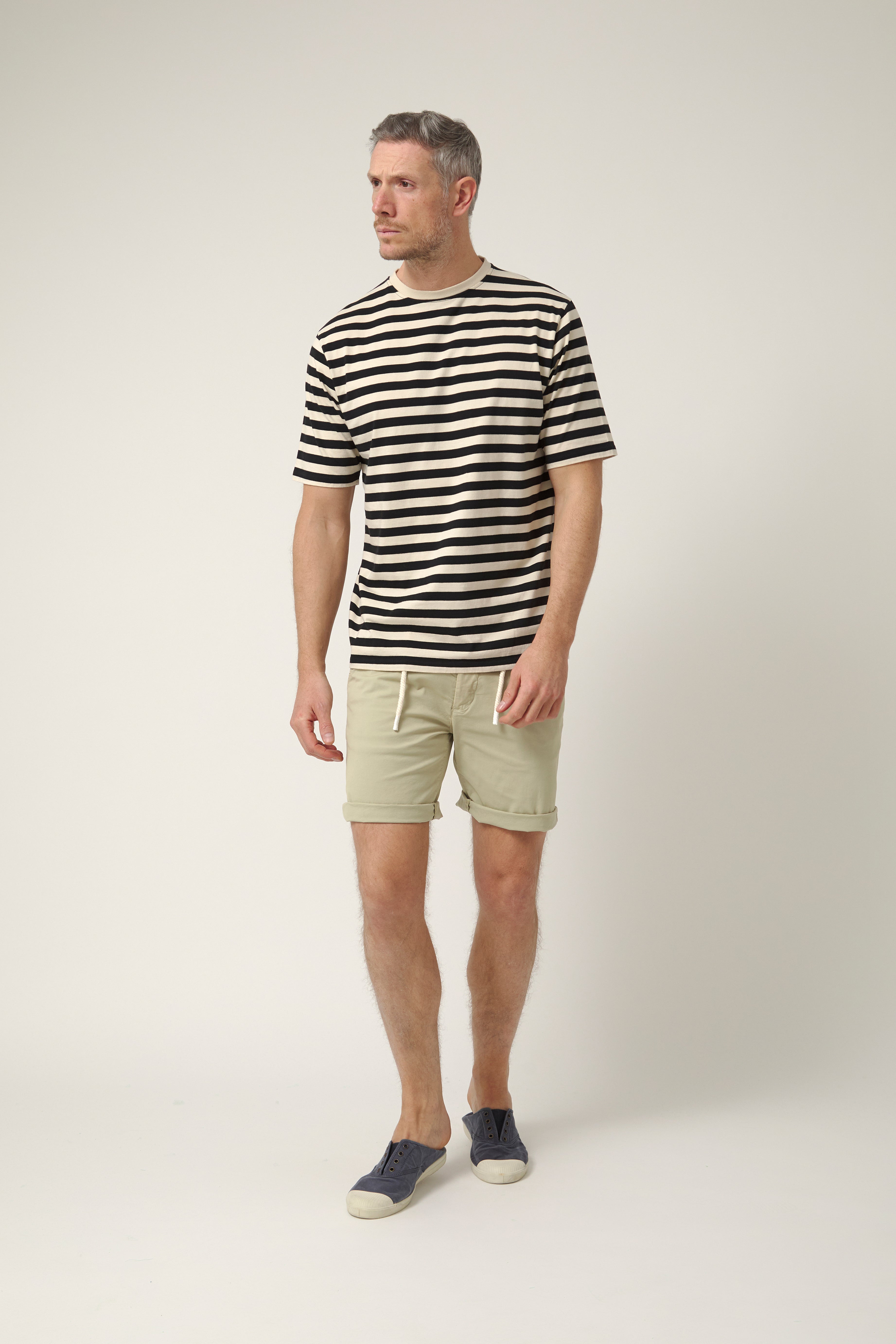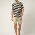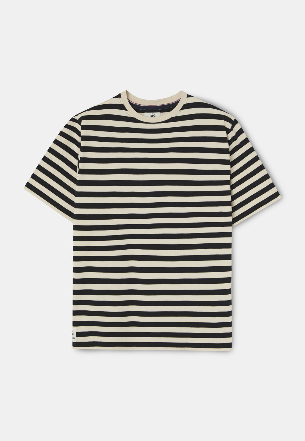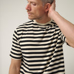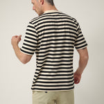 Camiseta de rayas en tonos crudo y negro, una prenda esencial pensada para durar y acompañarte en cualquier plan. Confeccionada en 100% algodón de alta calidad, ofrece un tacto suave y una sensación fresca y cómoda durante todo el día. Su diseño de rayas horizontales aporta un aire clásico y atemporal, fácil de combinar y siempre actual. Una camiseta versátil, honesta y sin artificios, ideal para llevar sola o bajo una sobrecamisa, y perfecta para quienes apuestan por prendas bien hechas y con personalidad propia.