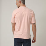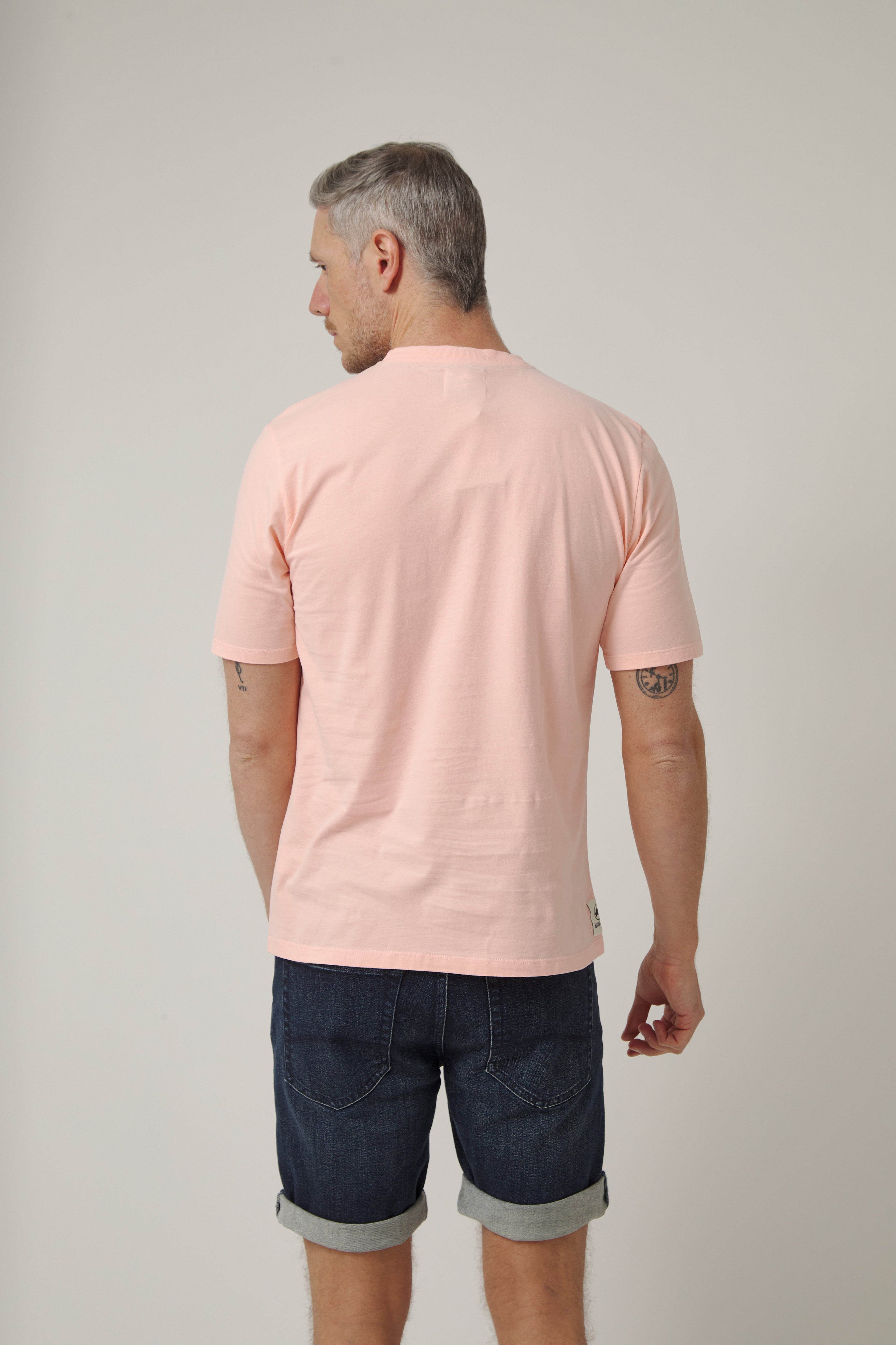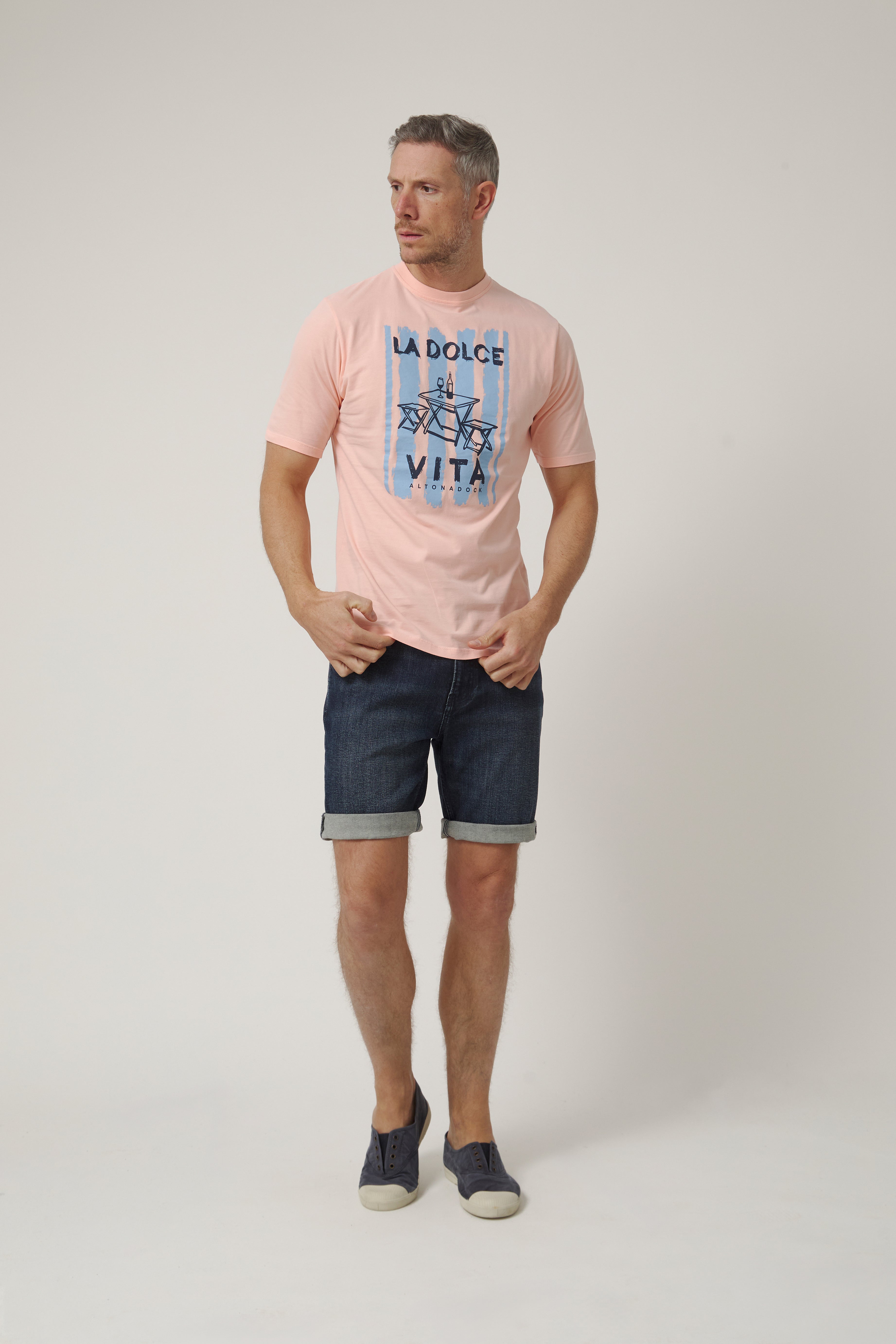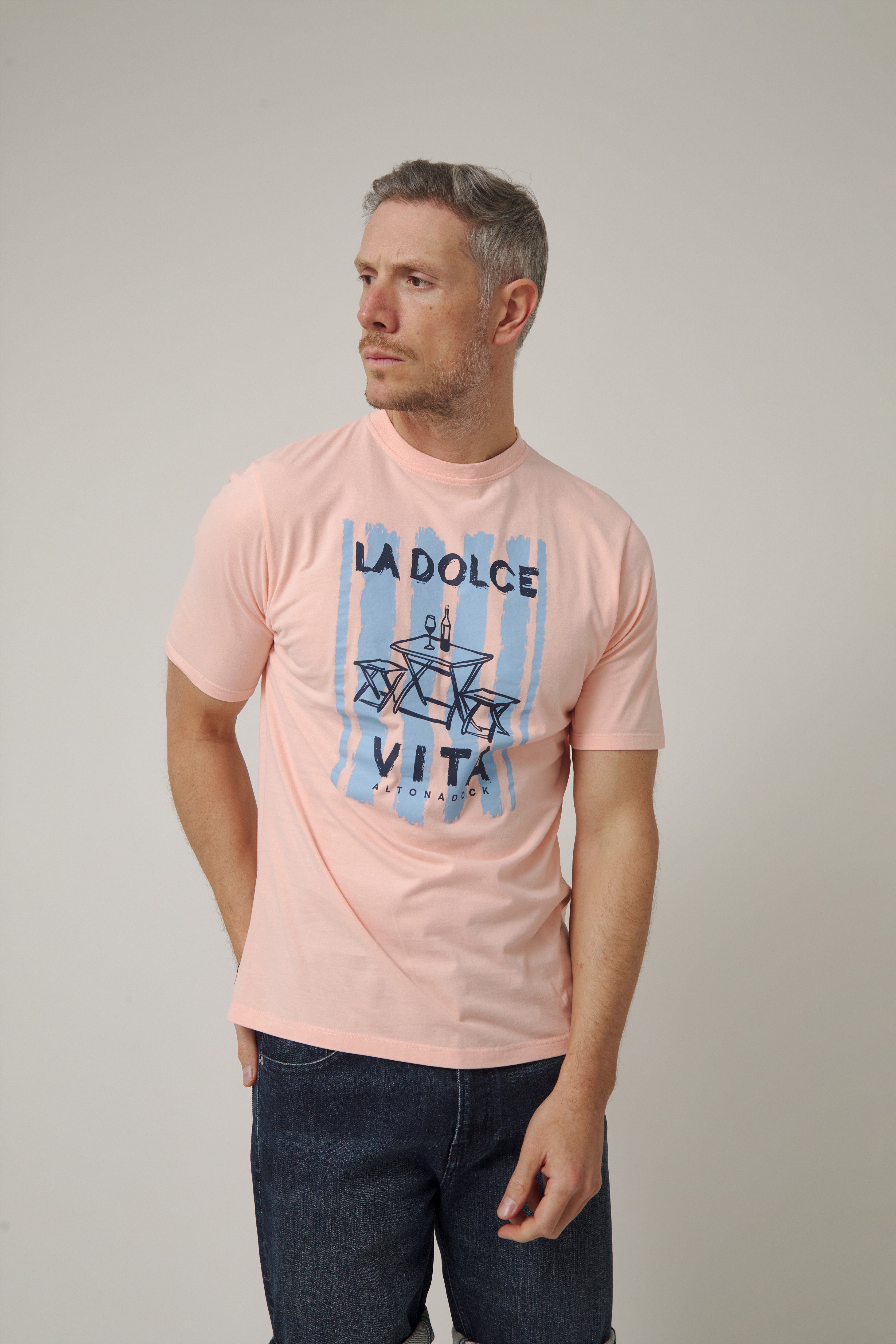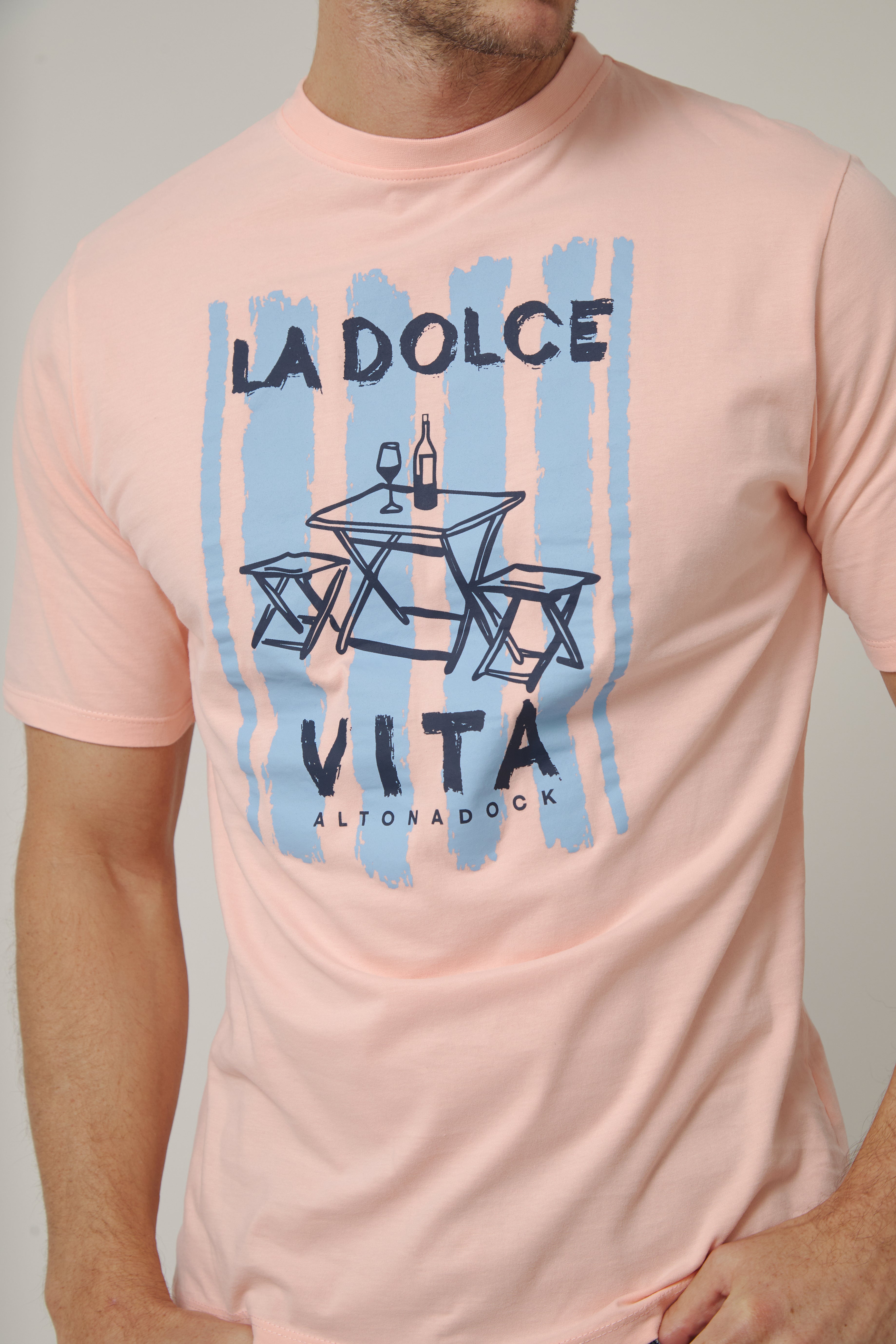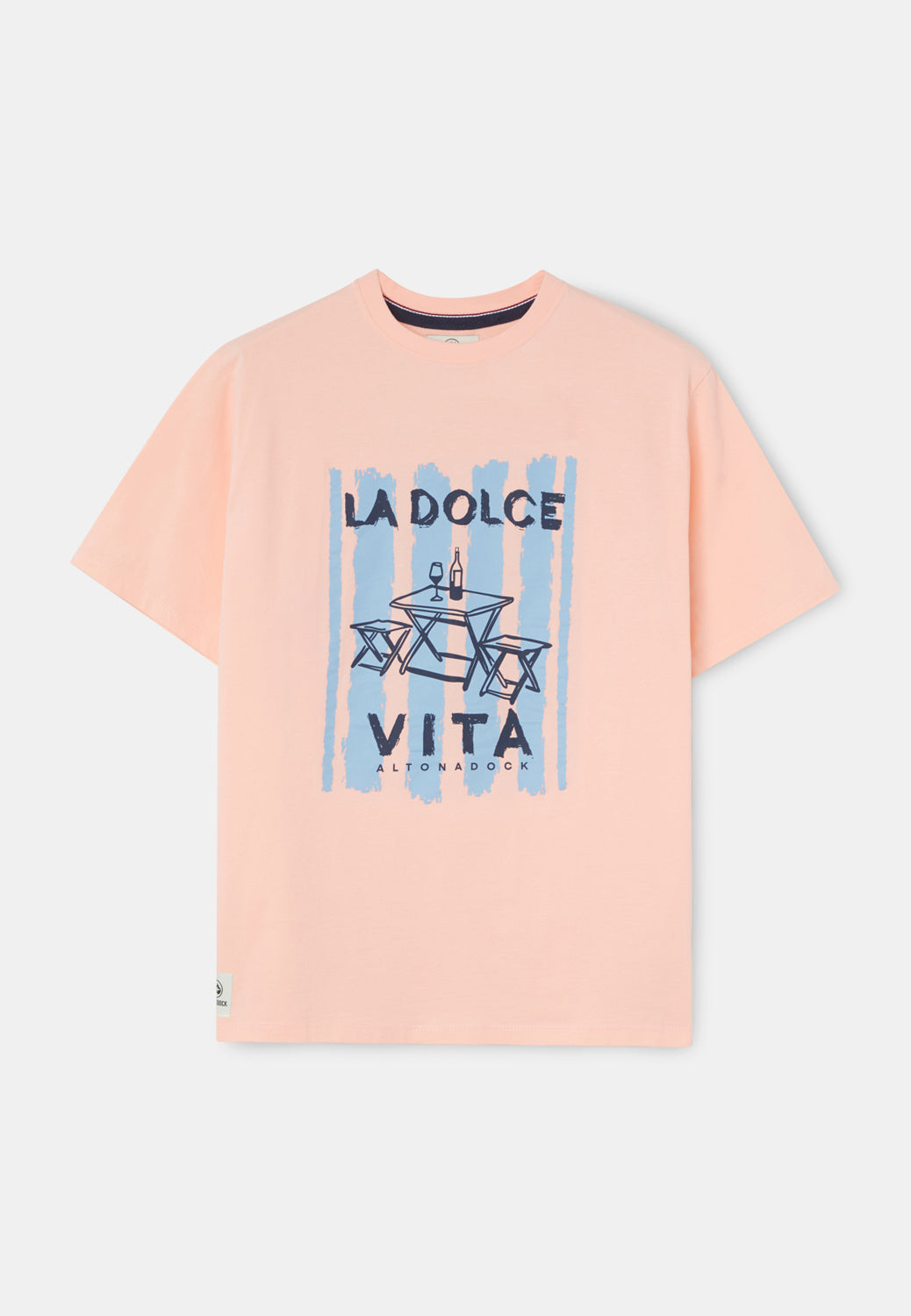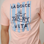 Camiseta de cuello redondo en tono rosa empolvado con gráfico frontal “La Dolce Vita”, acompañado de una ilustración de mesa y sillas dibujadas a línea y enmarcadas por trazos verticales en azul. Un diseño que evoca esos momentos de pausa frente al mar, cuando el tiempo se estira y todo ocurre sin prisa.