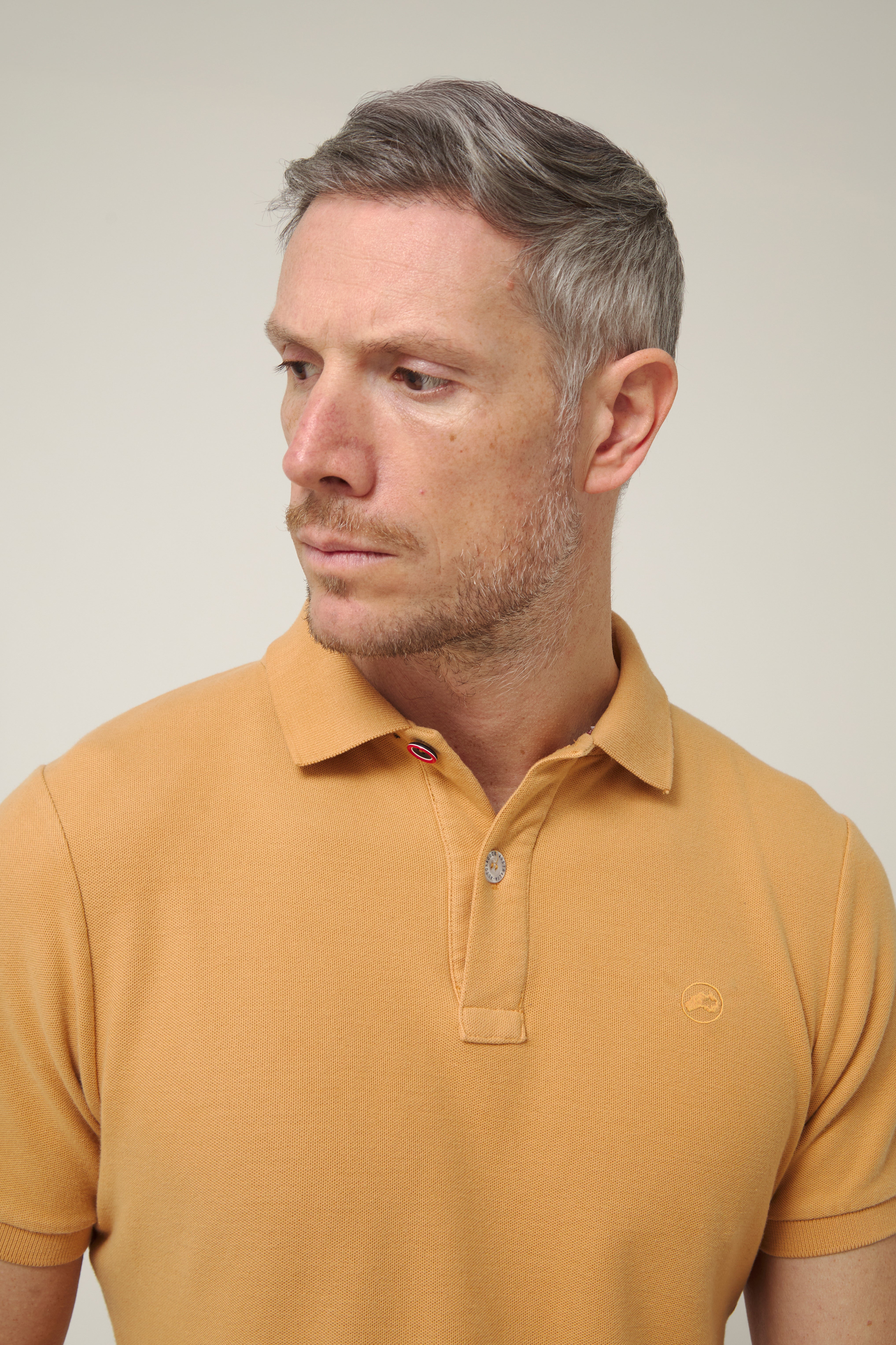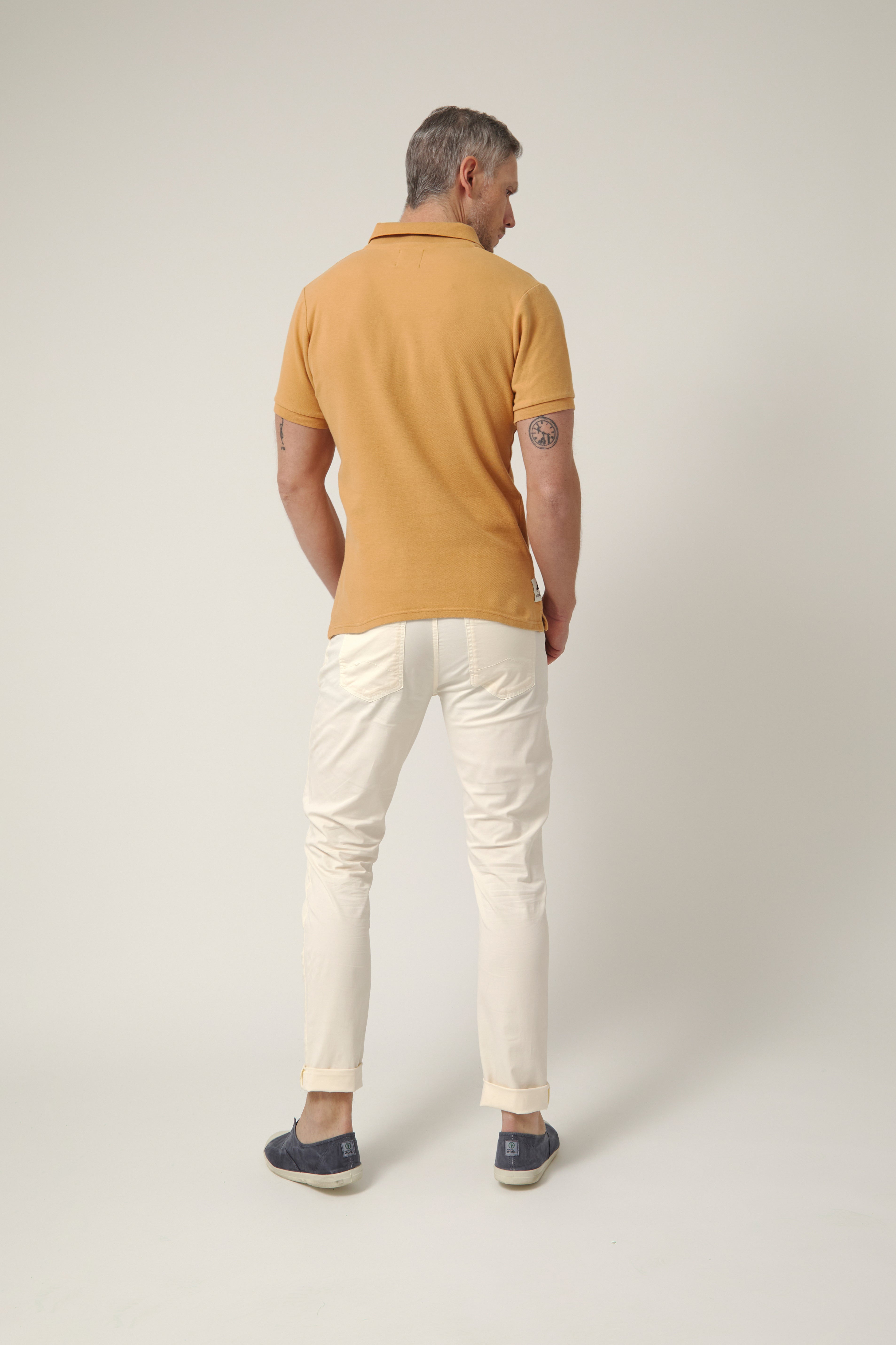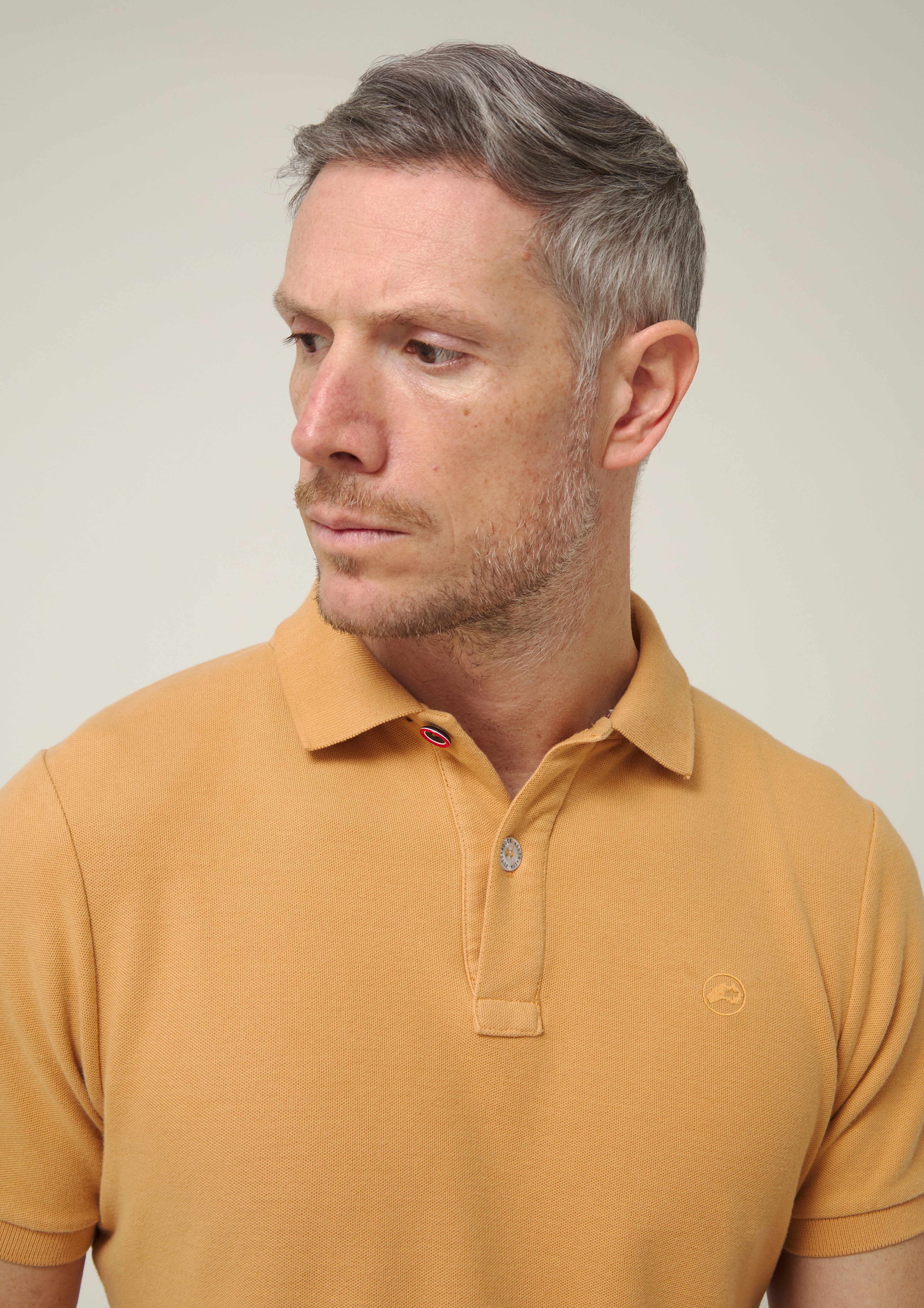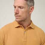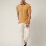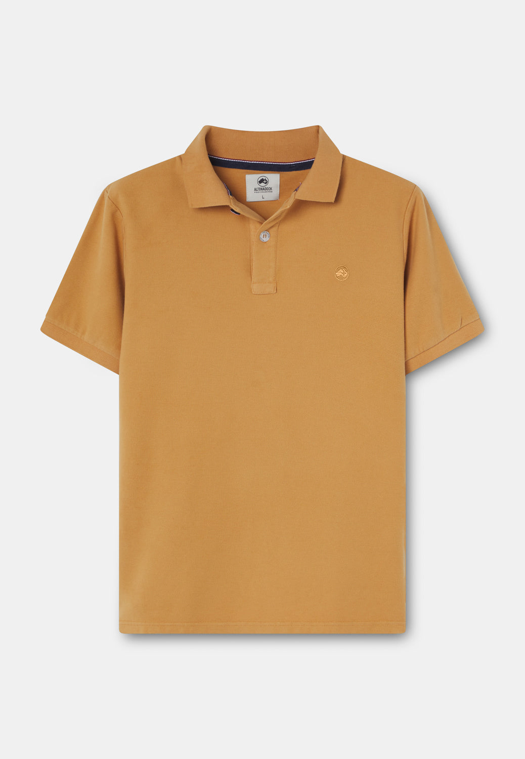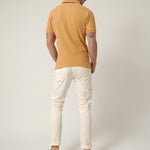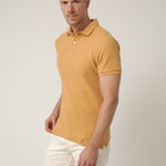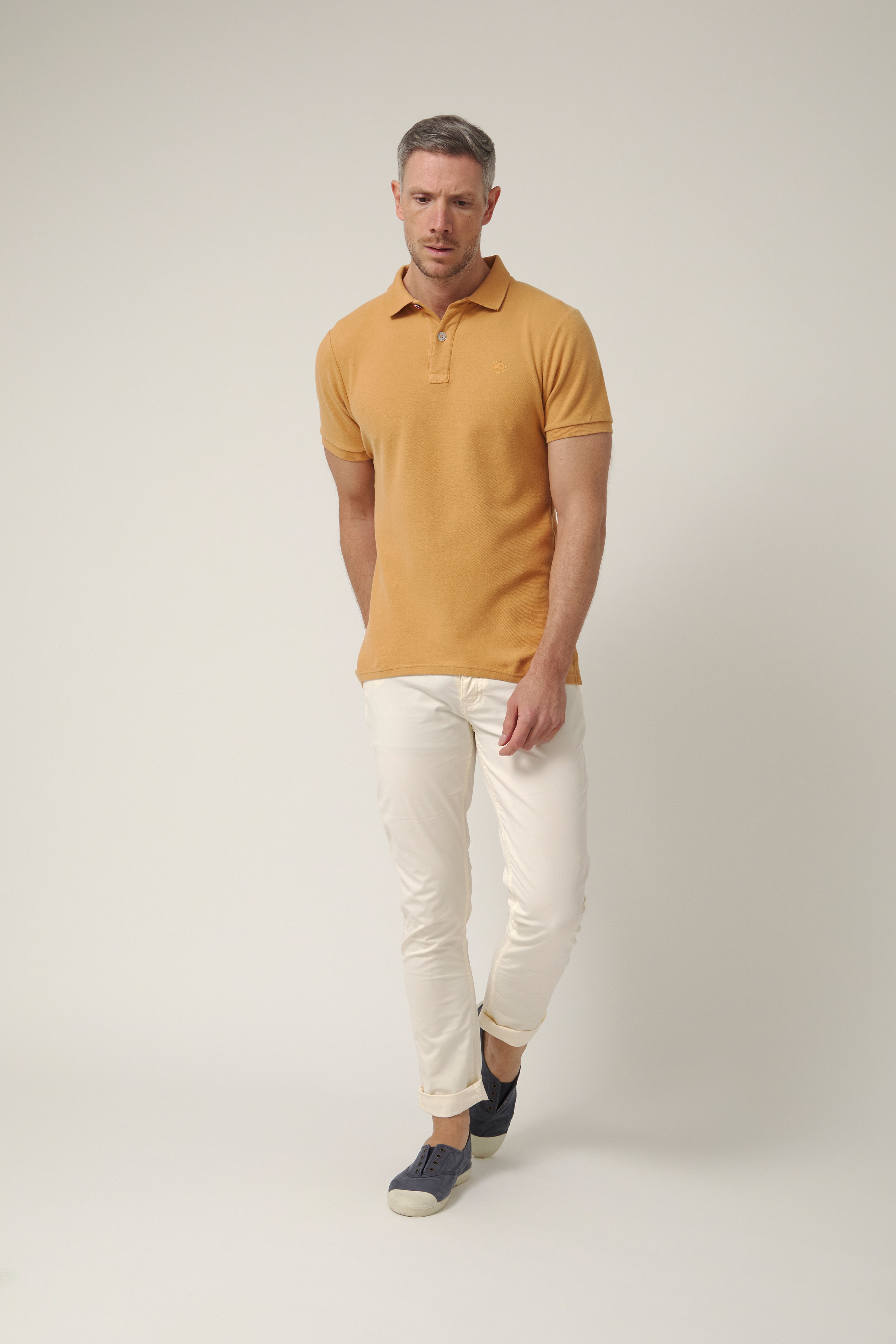 Polo de manga corta en tono camel cálido, un color inspirado en las rocas y acantilados que se asoman al Atlántico en la costa del norte. Un tono natural y equilibrado que transmite carácter y conexión con el paisaje, perfecto para acompañar los días al aire libre.
