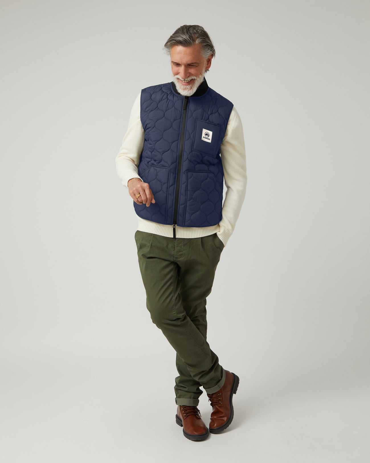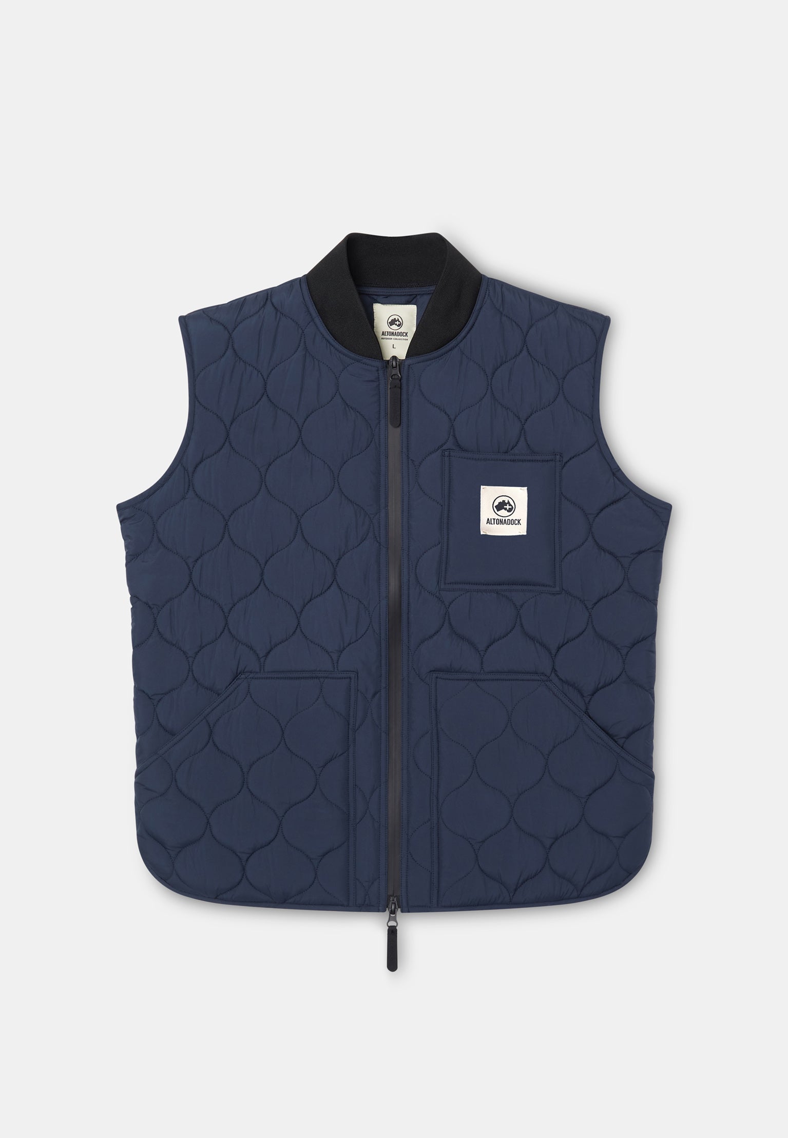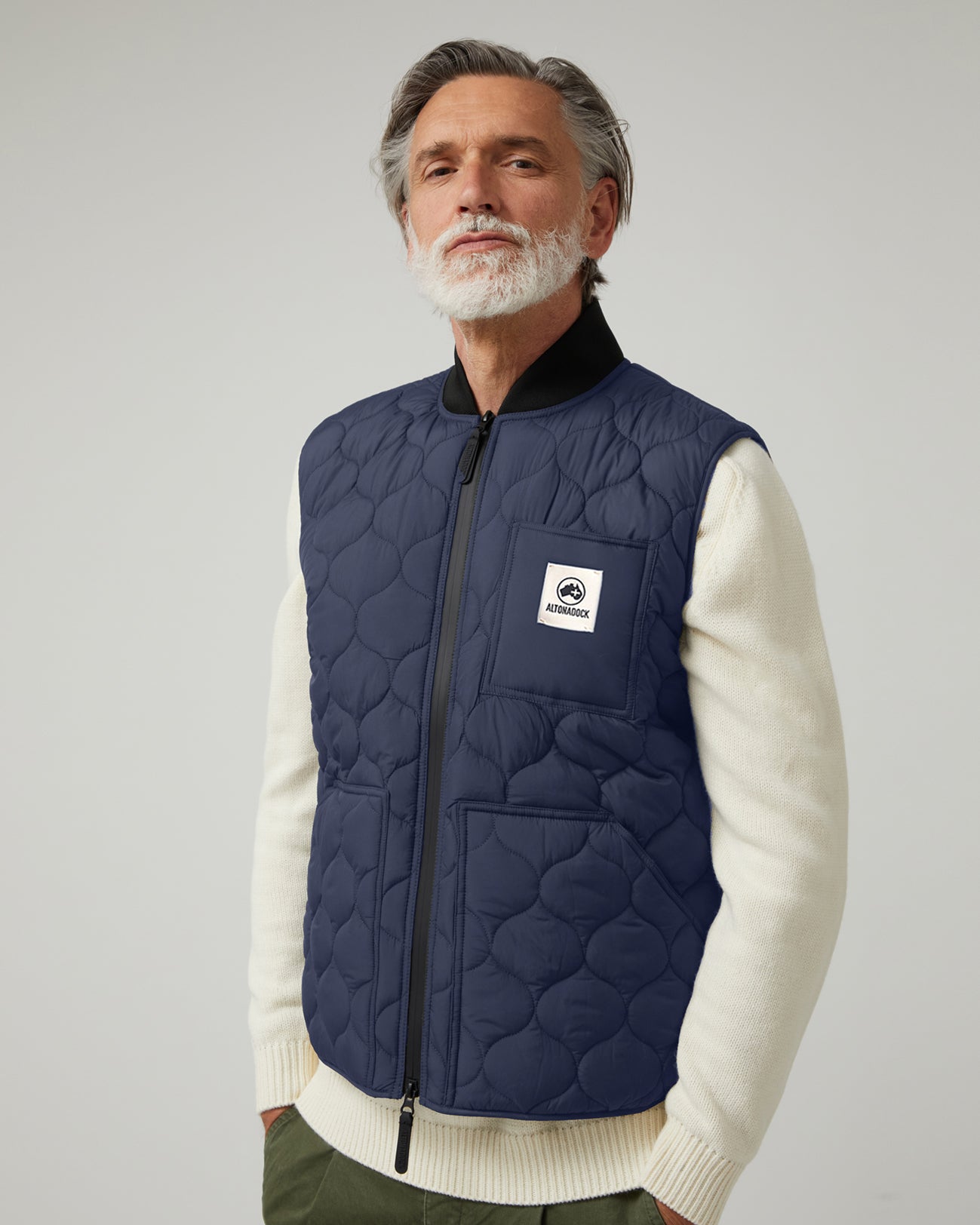 l Chaleco Nomad Azul Marino de Altonadock combina diseño contemporáneo, ligereza y funcionalidad en una prenda perfecta para el día a día. Su aislamiento térmico mantiene el calor sin añadir volumen, convirtiéndolo en la capa intermedia ideal o en una prenda exterior versátil. El acolchado con patrón geométrico aporta un estilo moderno y urbano, mientras que los bolsillos frontales y el cierre con cremallera garantizan practicidad. Perfecto para combinar con camisas, sudaderas o jerséis, es un básico funcional con un toque sofisticado.