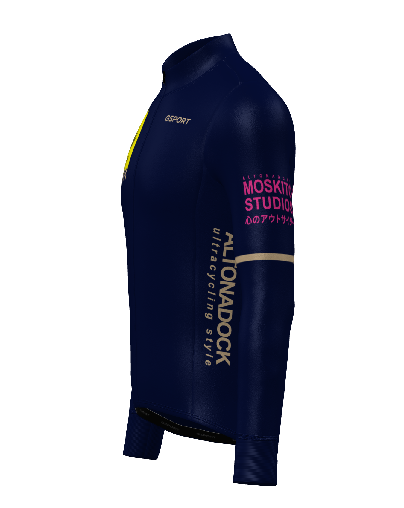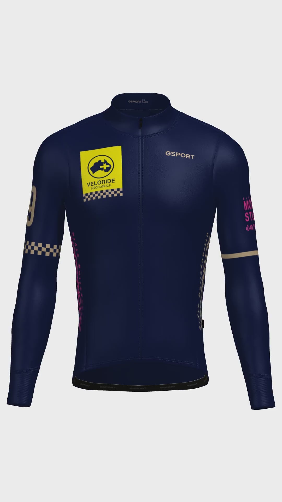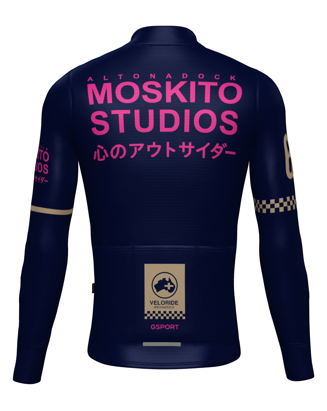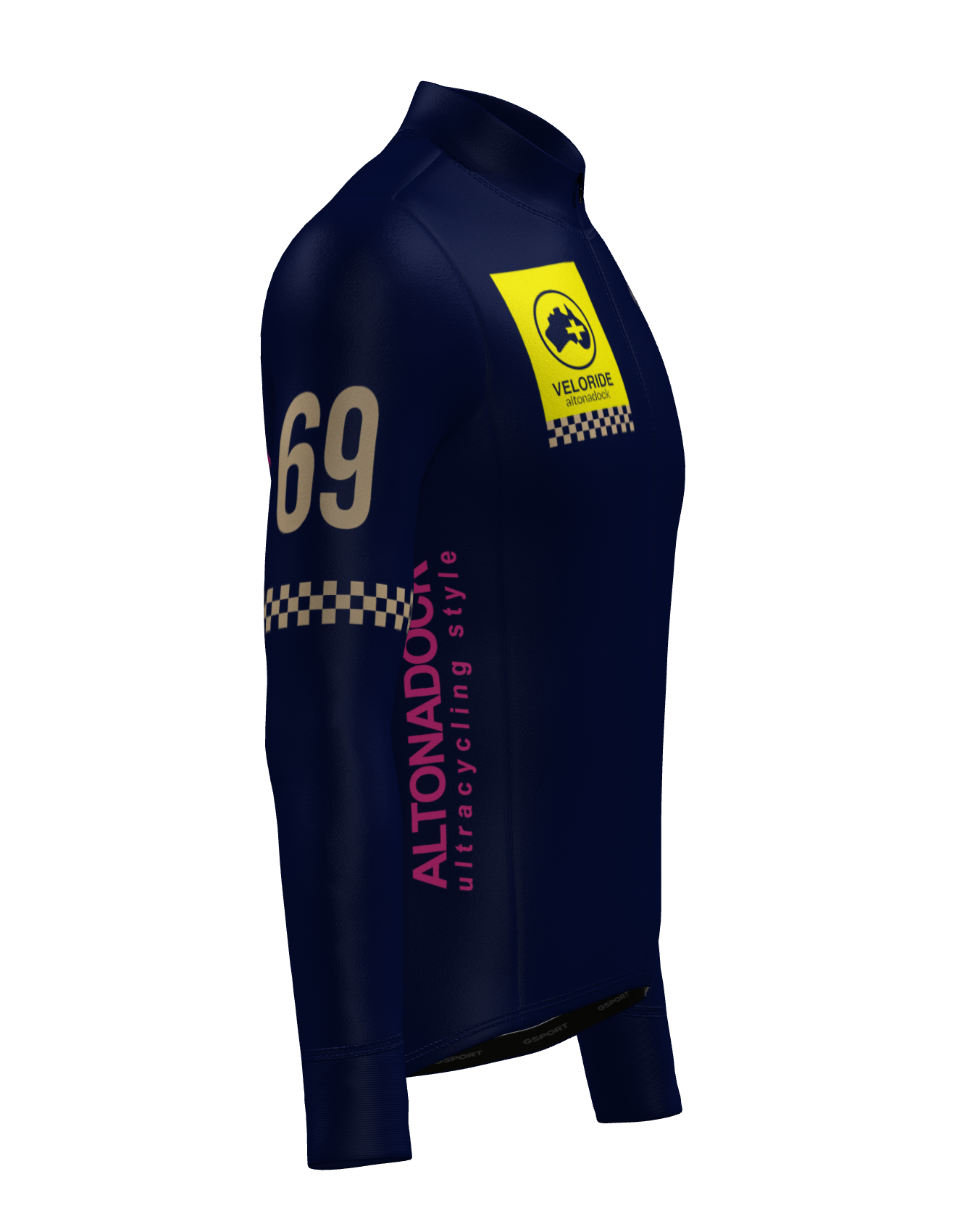 El Maillot Veloride Altonadock de manga larga combina rendimiento técnico y un diseño distintivo inspirado en el universo racing y ultracycling de la marca. Confeccionado en color azul marino, destaca por los gráficos en contraste: el bloque frontal Veloride en amarillo con detalles en arena, la numeración “69” en la manga y las tipografías laterales “Altonadock ultracycling style”. En la espalda, el claim “MOSKITO STUDIOS” en rosa aporta un carácter visual potente y contemporáneo.