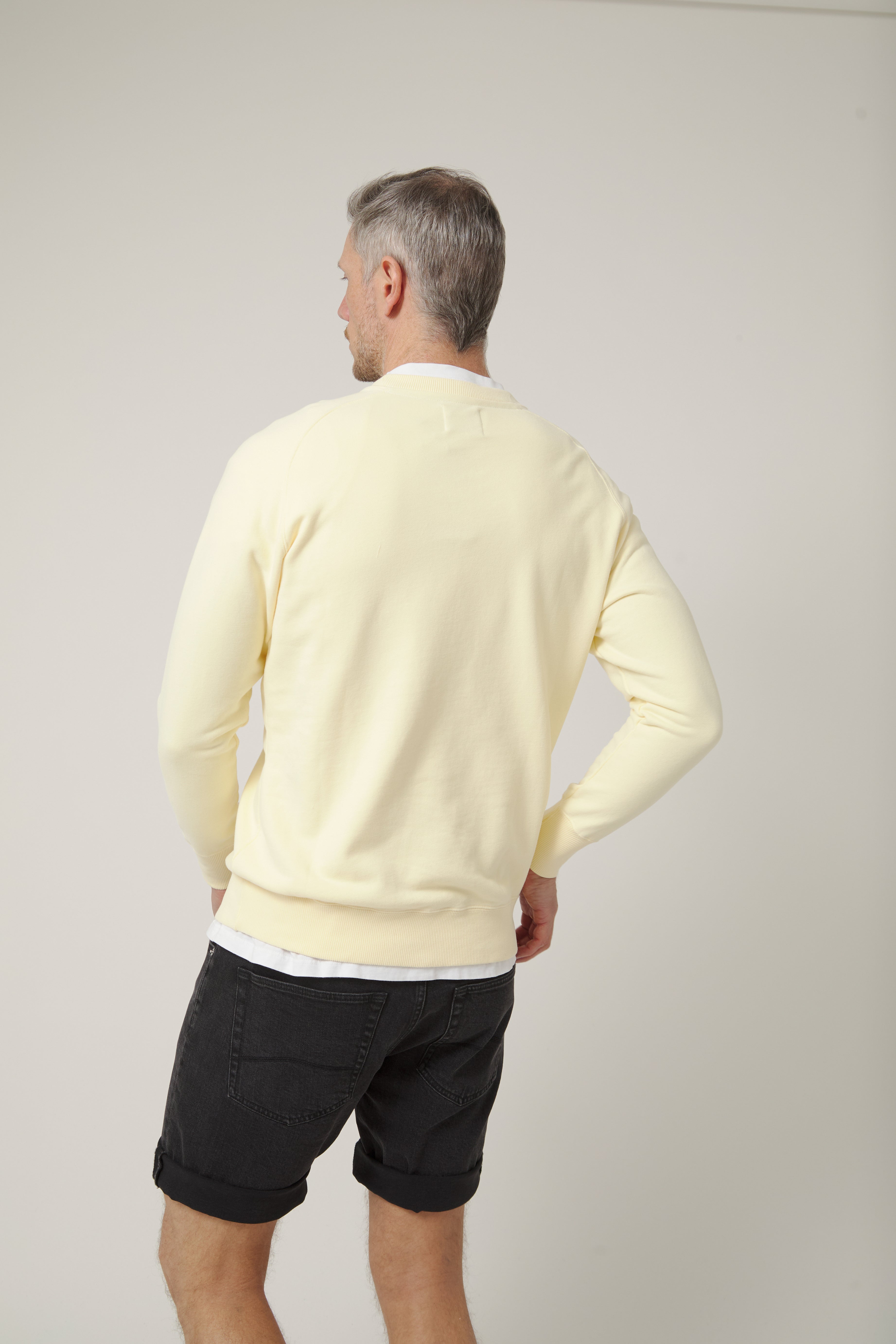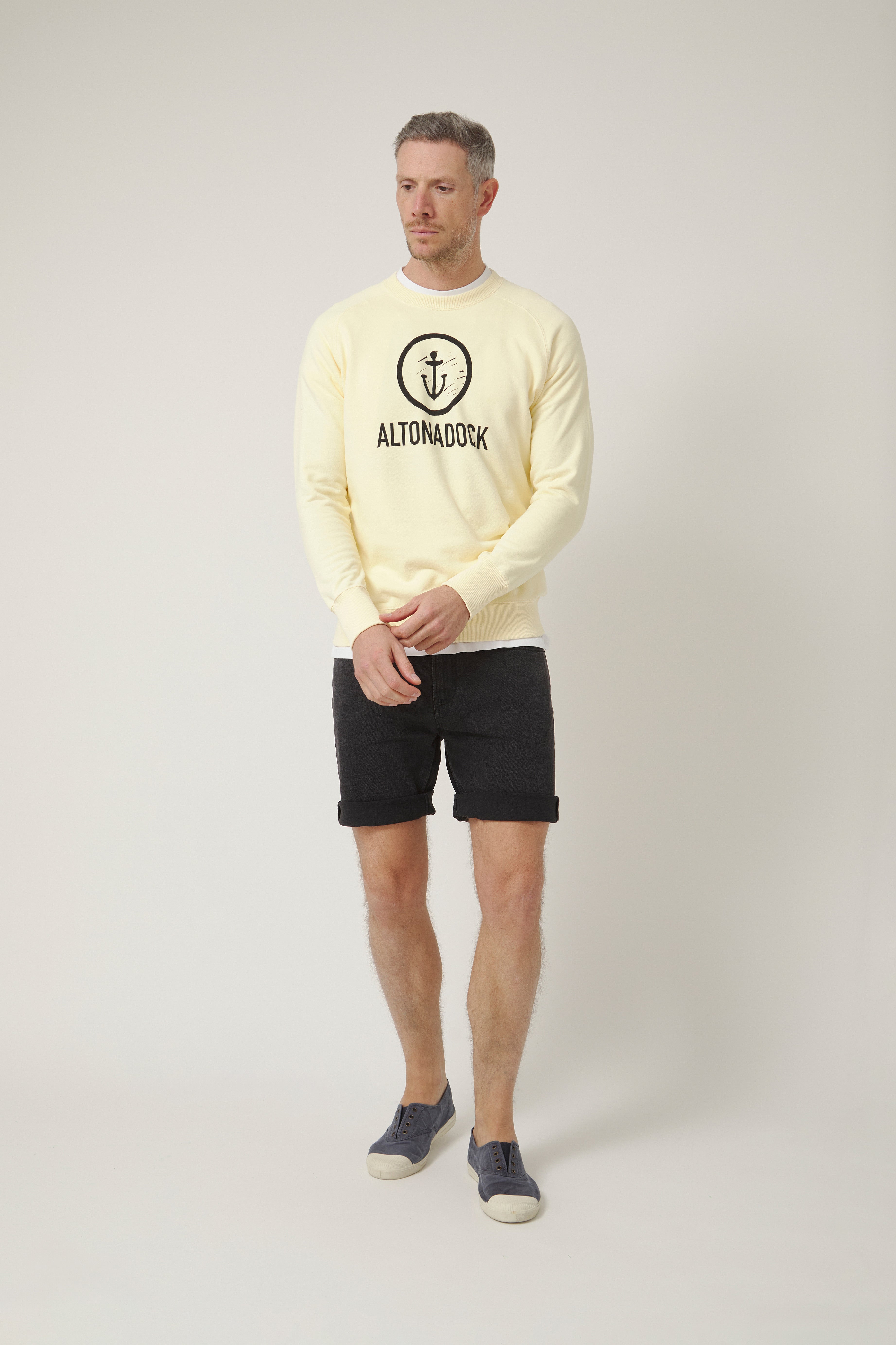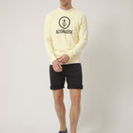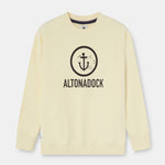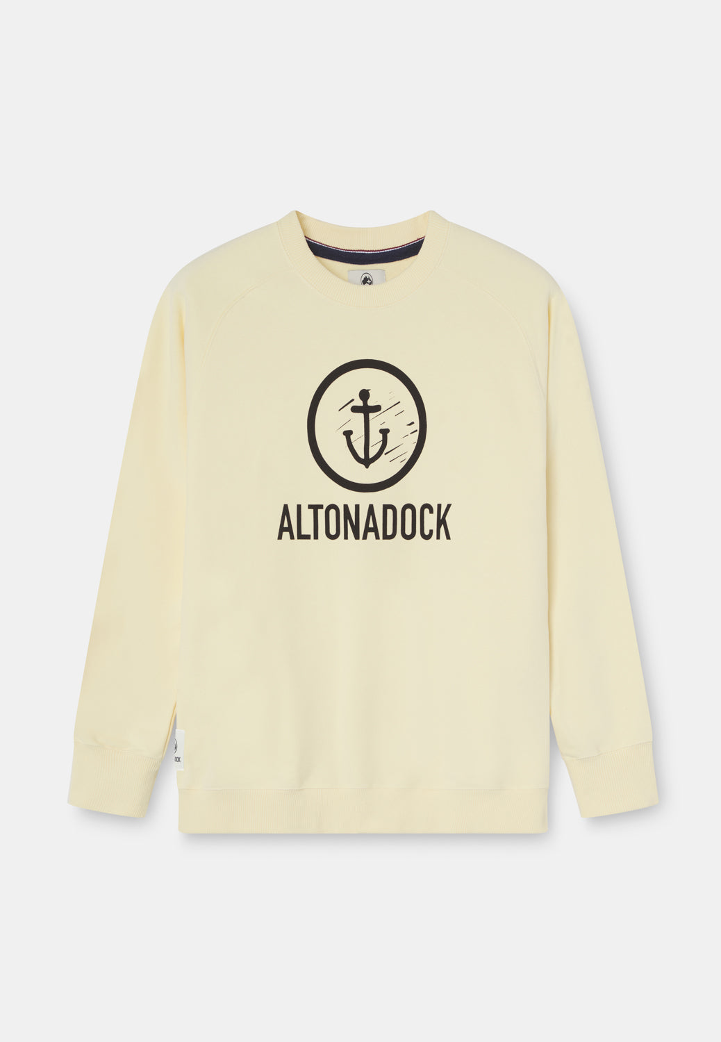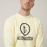 Sudadera de cuello redondo en tono vainilla con un diseño claro y con presencia, inspirado en el mar y en esa idea de mantener el rumbo: una pieza que habla de costa, de norte y de movimiento sin necesidad de cargarla de detalles.