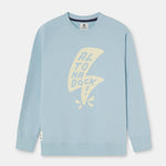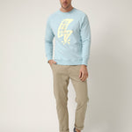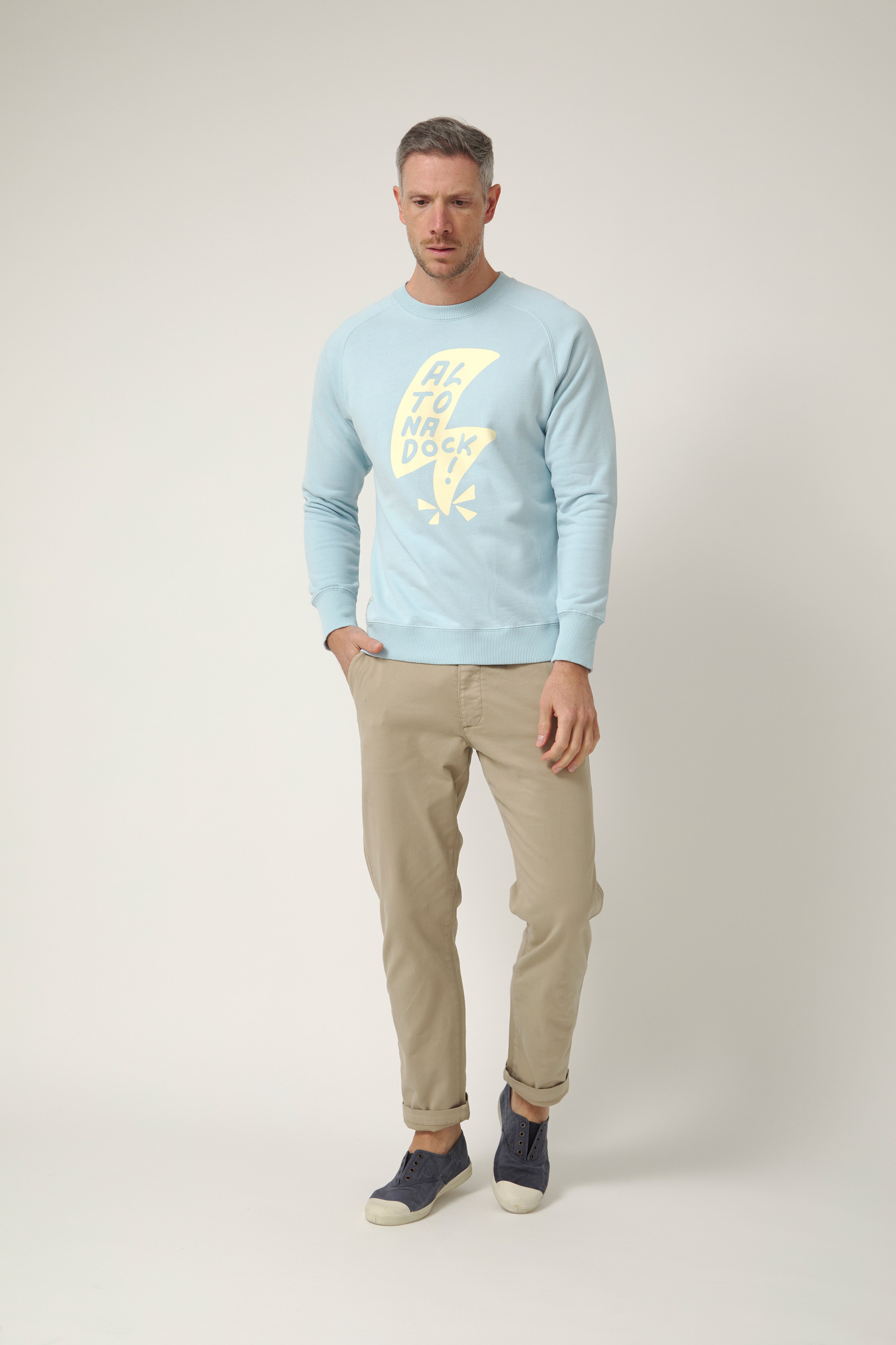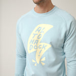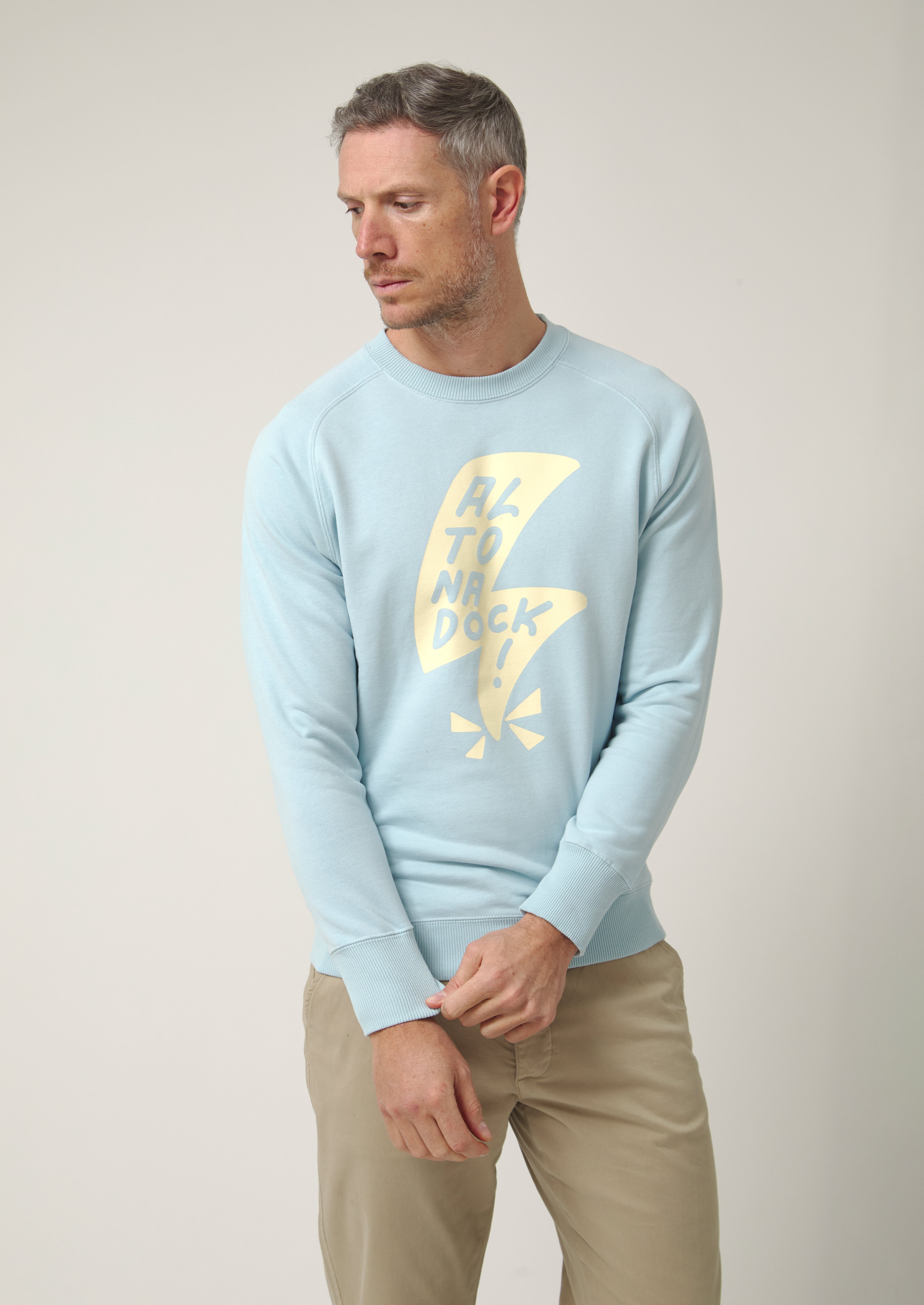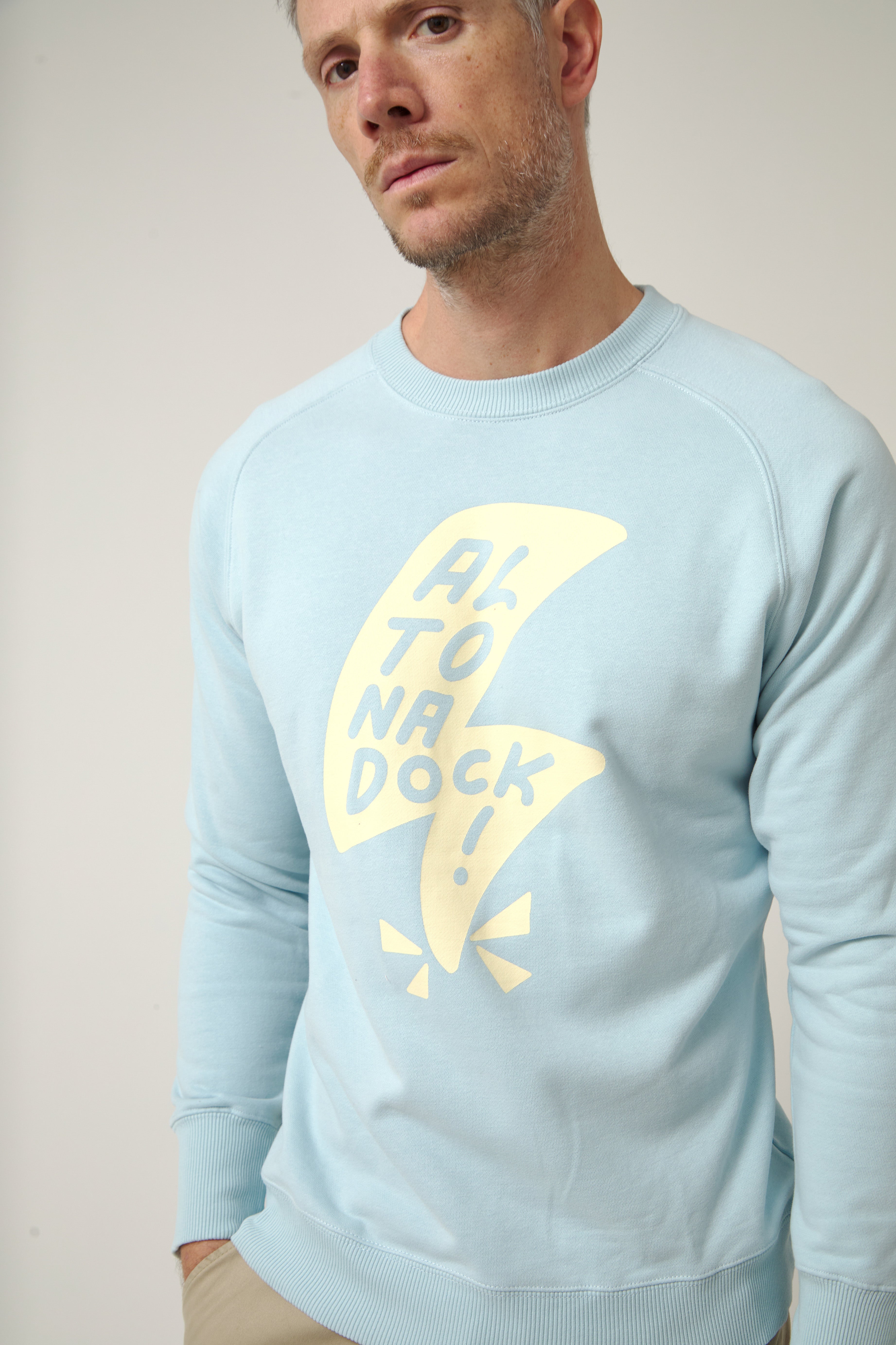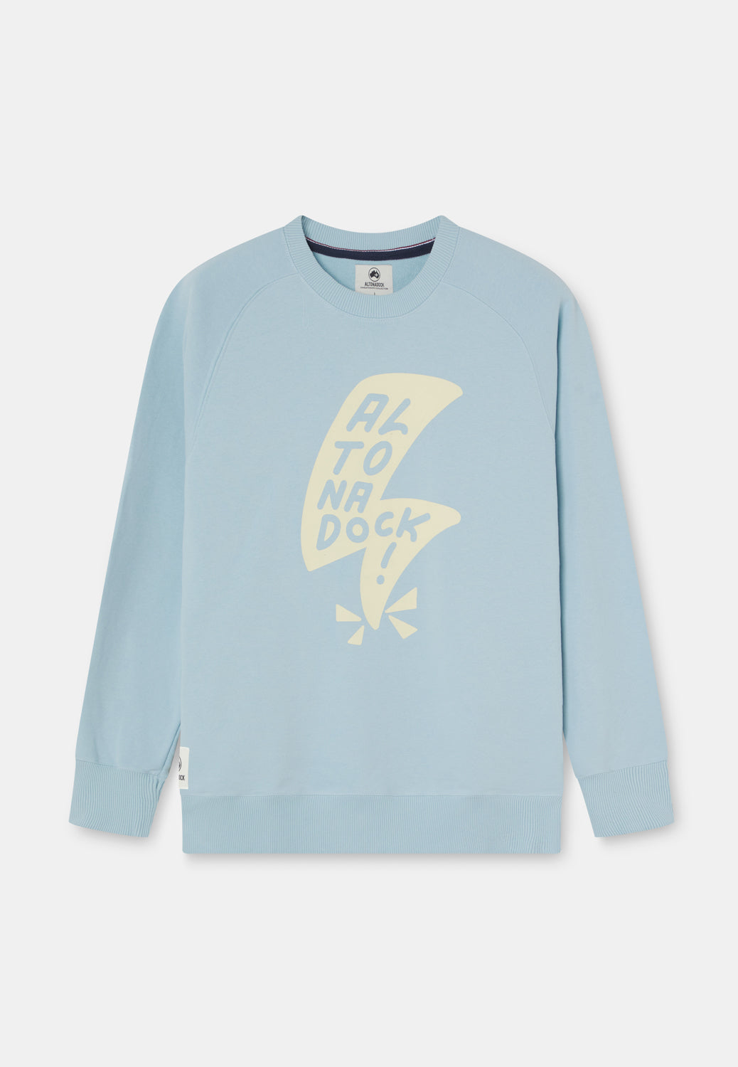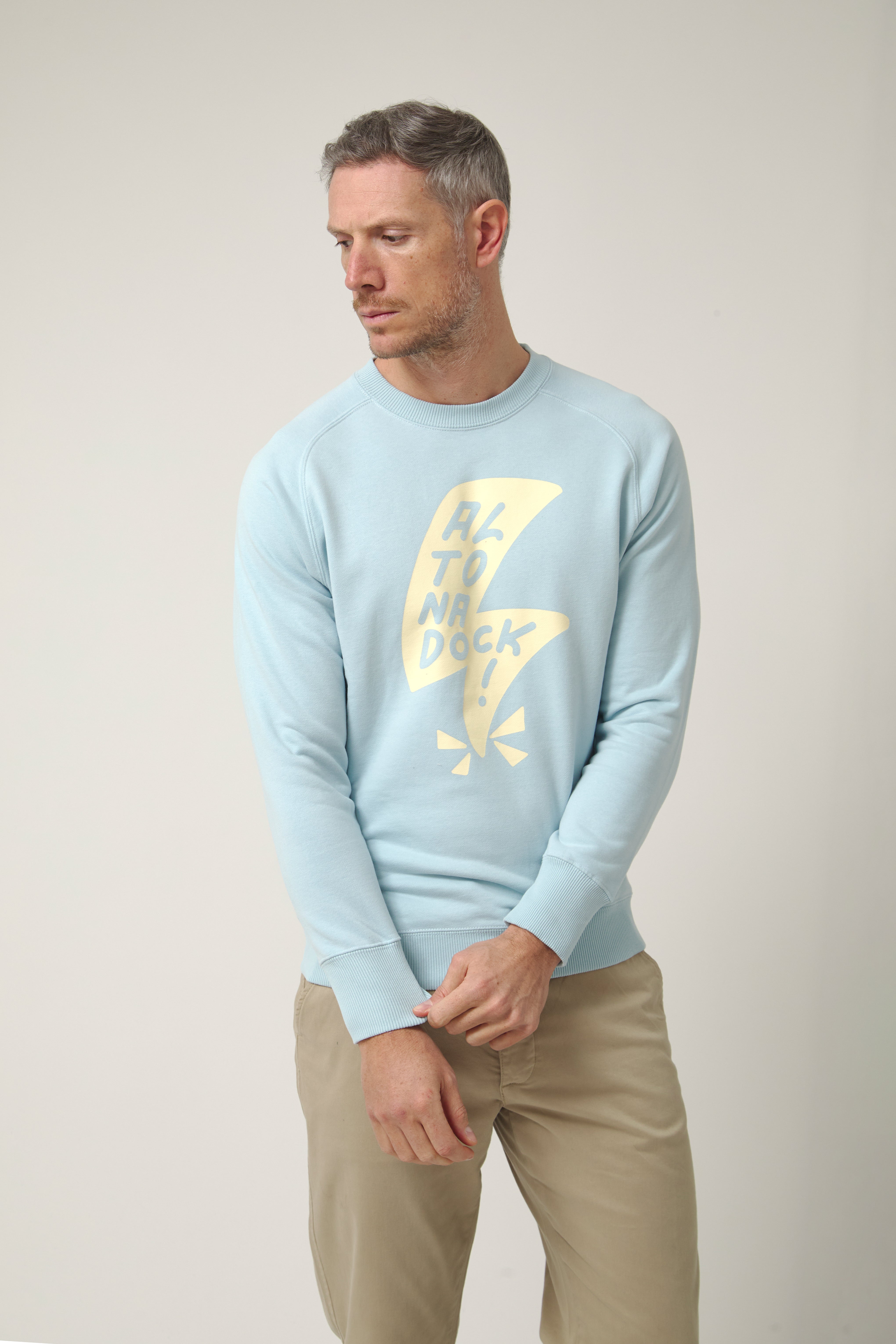 Sudadera de cuello redondo en azul claro con gráfico frontal de rayo y lettering “Altonadock” integrado en el diseño. Una ilustración con trazo contundente y contraste marcado en un tono beige que rompe con lo sereno y conecta con la parte más cruda del norte: viento, choque y energía en movimiento.