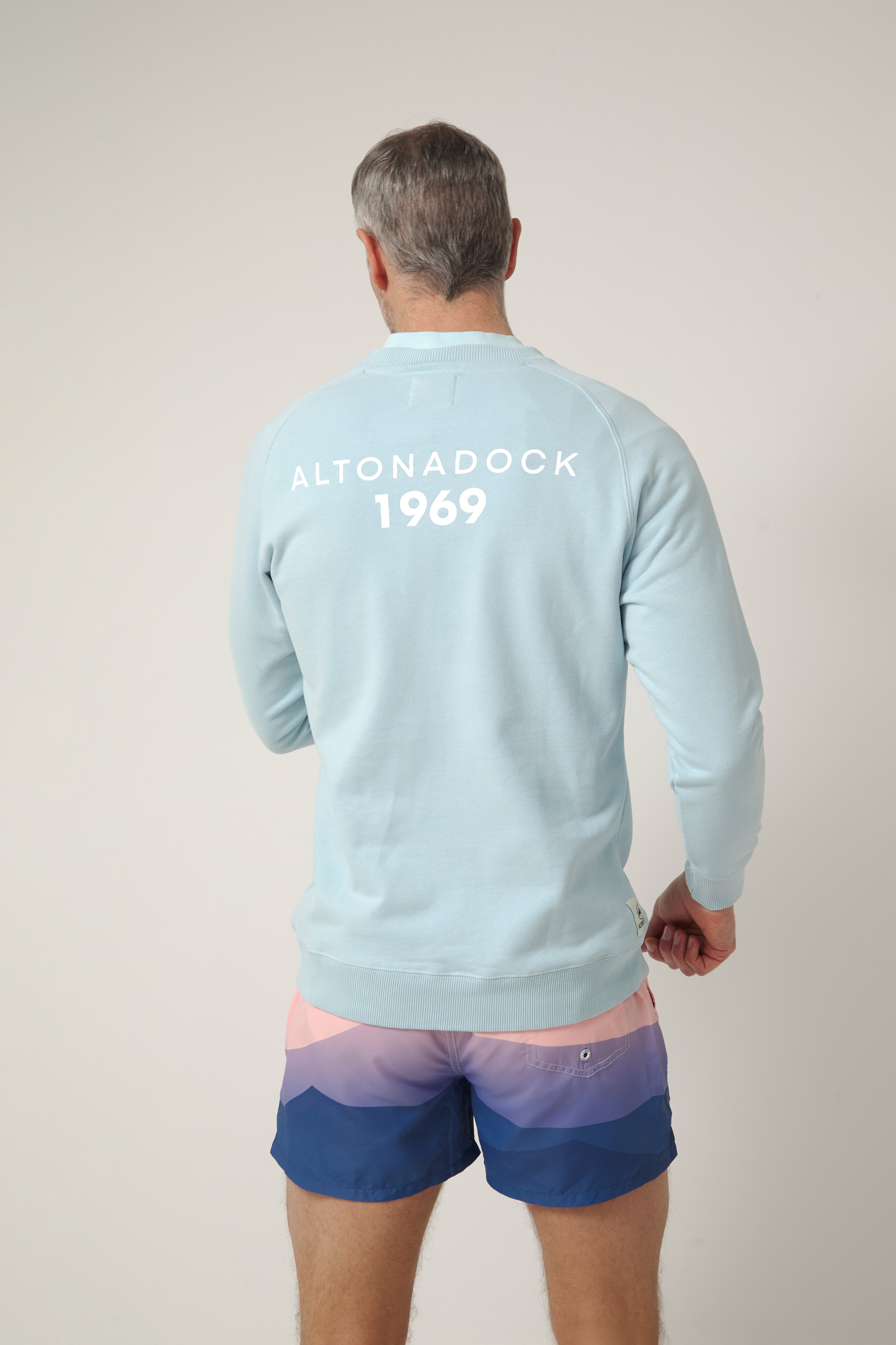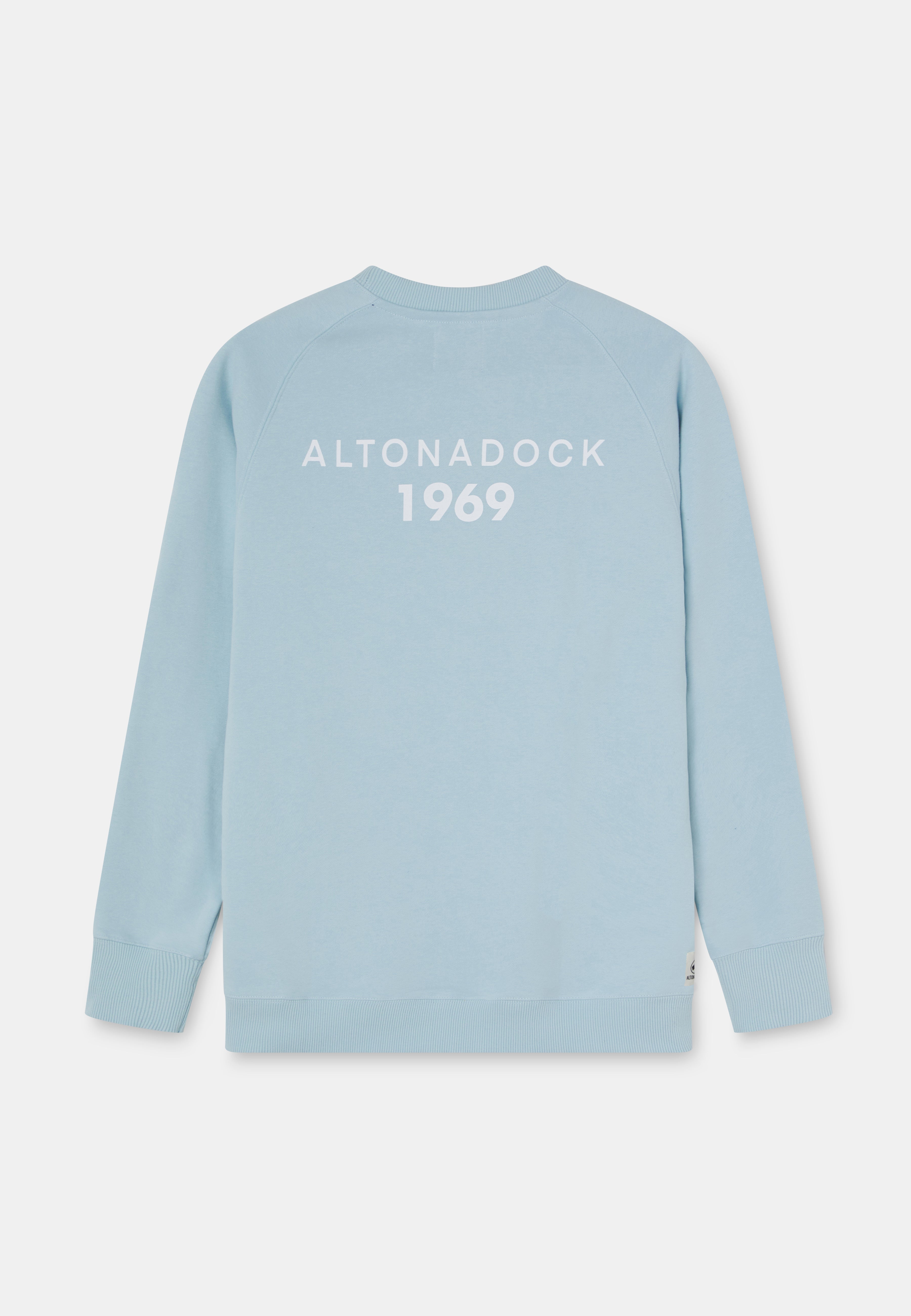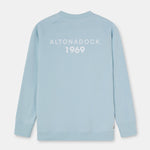 Sudadera en color azul claro con gráfico trasero “Altonadock 1969”, una prenda que forma parte de la cápsula Surfing 1969. Una edición especial que rinde homenaje al origen y al punto de partida de nuestra historia.