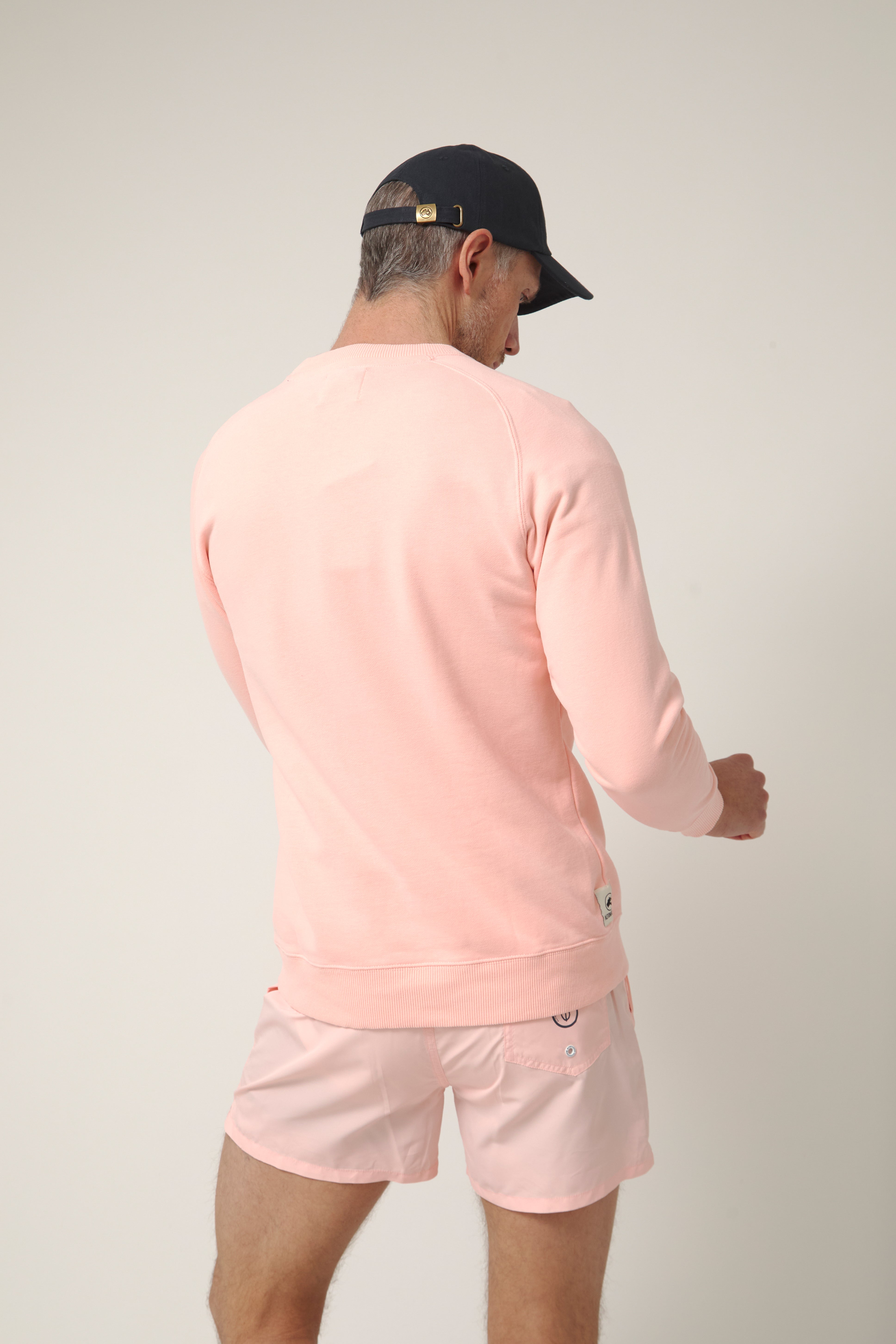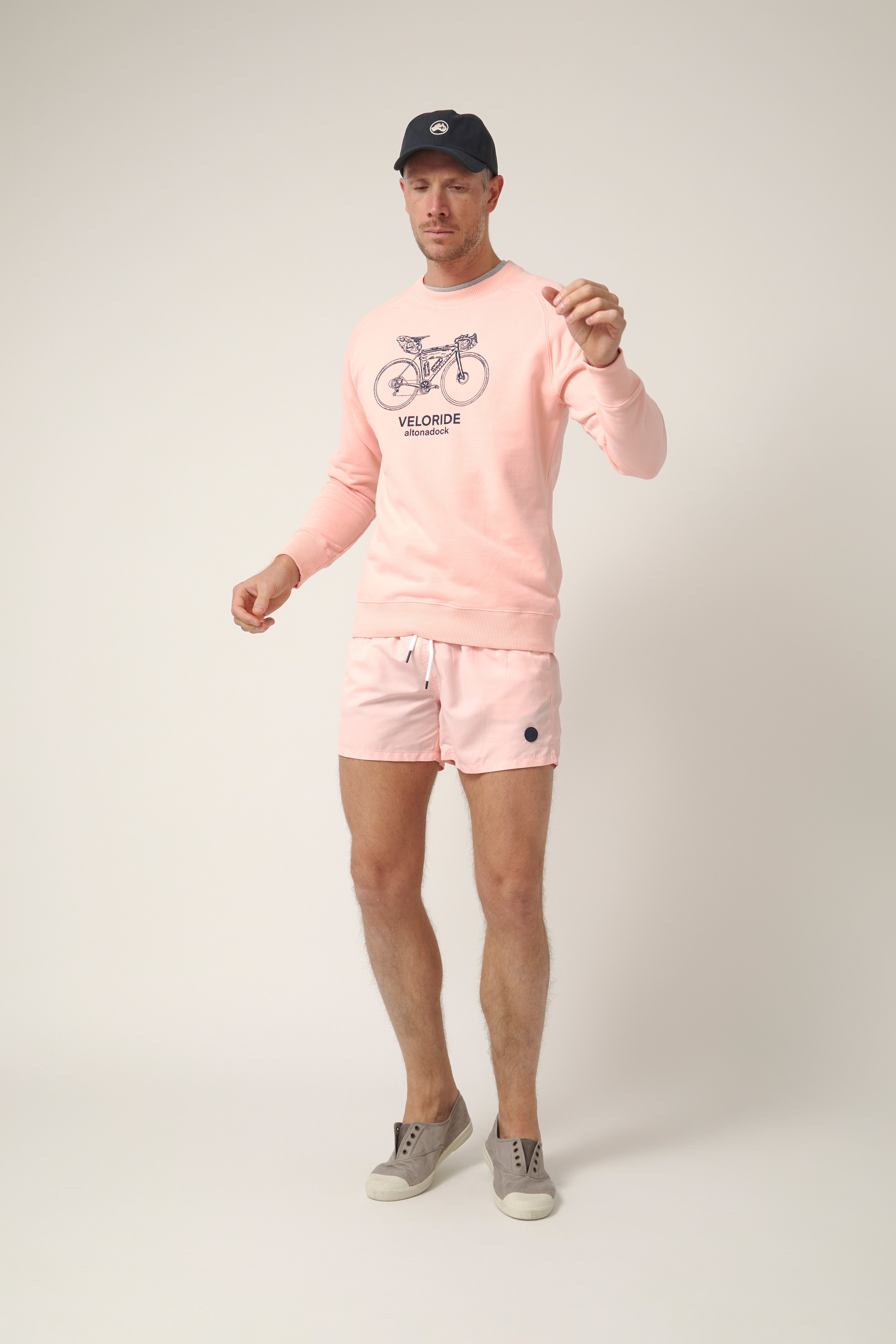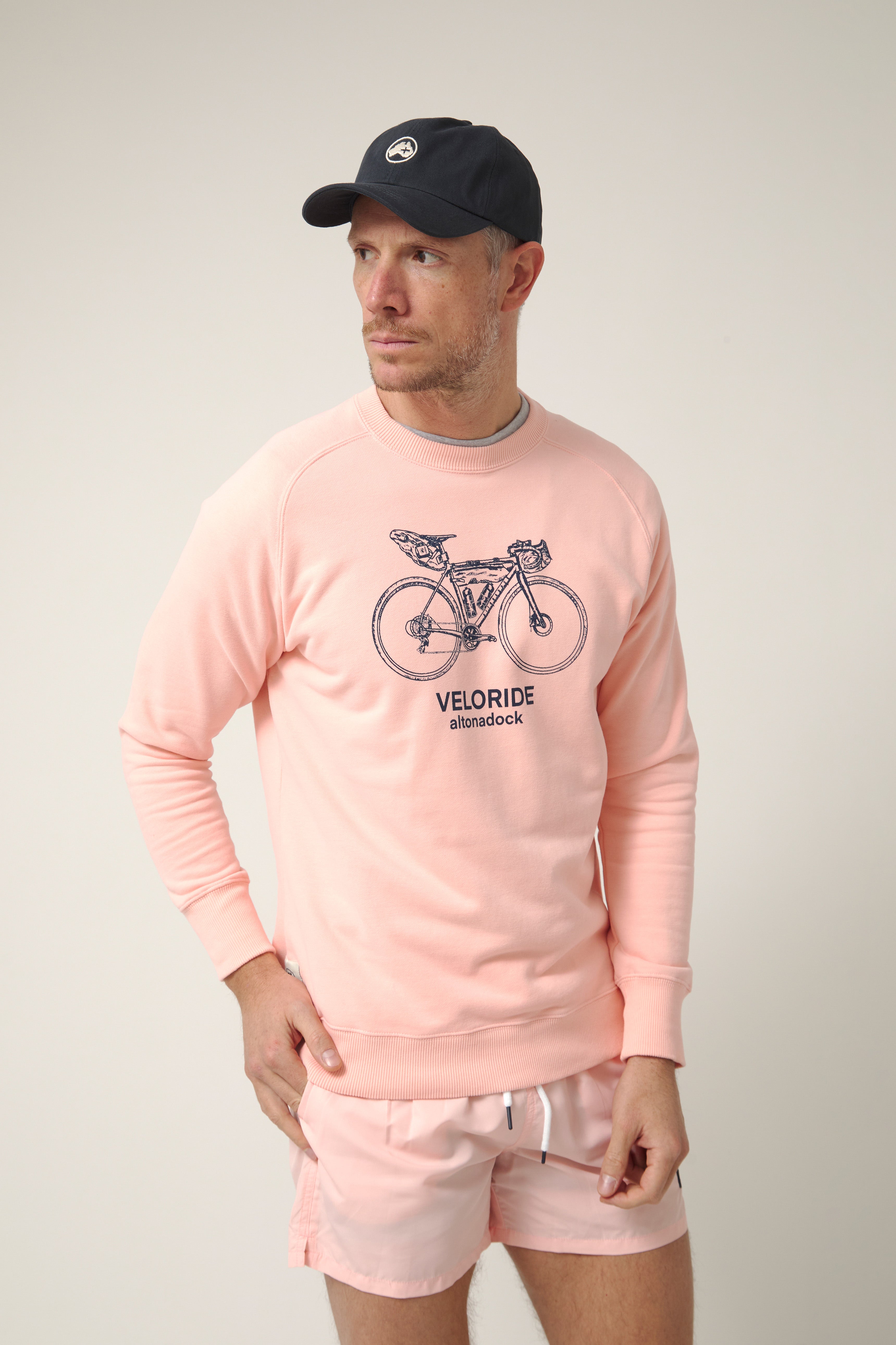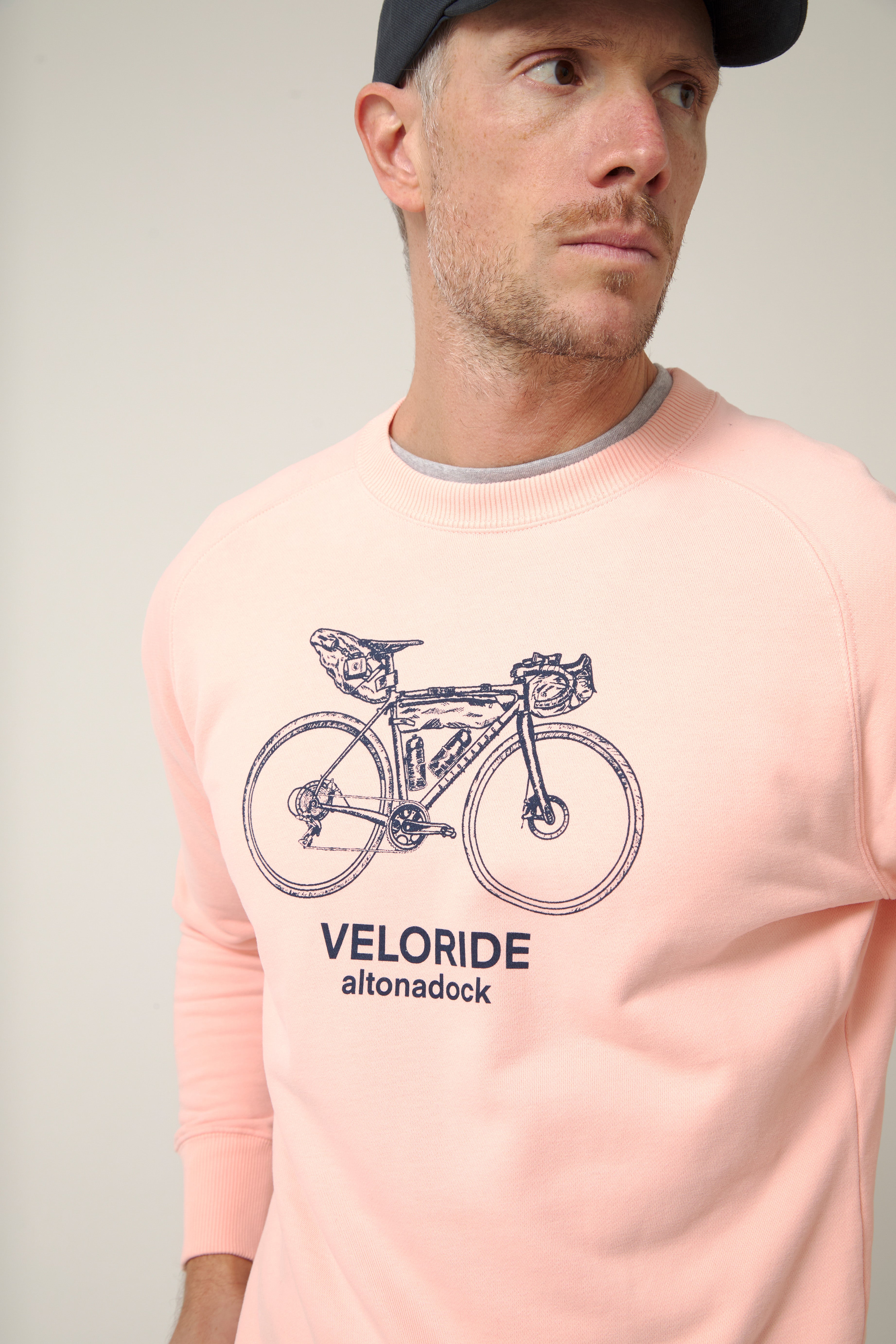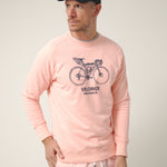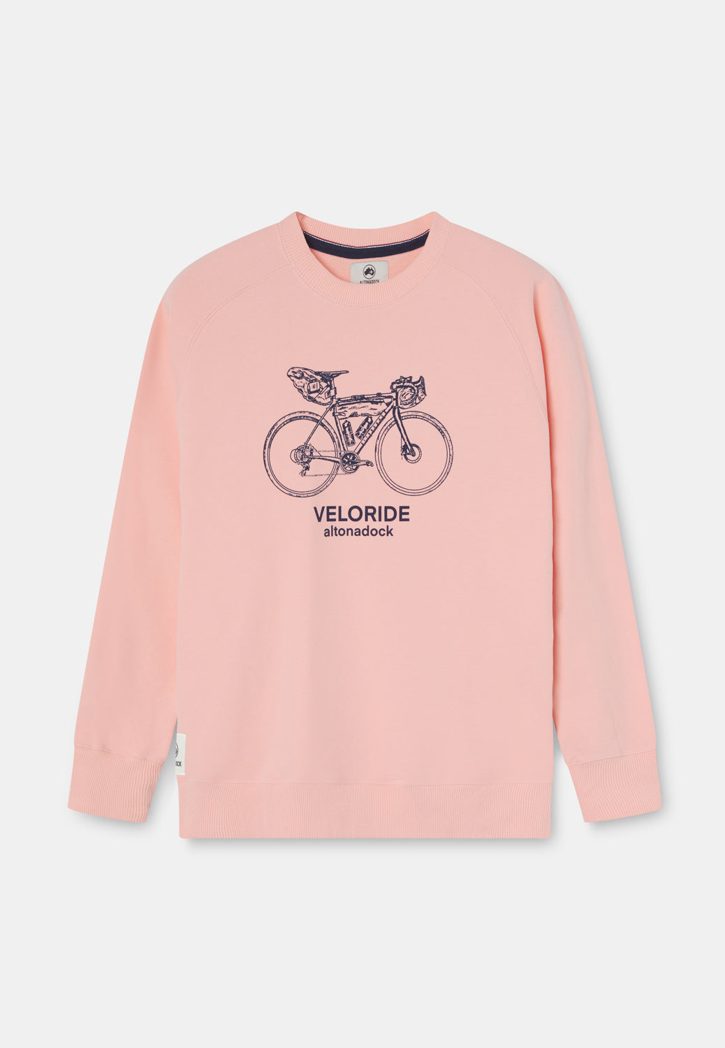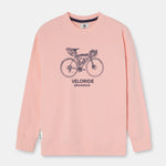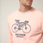 Sudadera de cuello redondo en tono rosa empolvado con gráfico frontal de bicicleta de viaje y el texto “Veloride Altonadock” serigrafiado en contraste. La ilustración, dibujada a línea y cargada de detalle, remite a las rutas largas, al avance constante y a la idea de recorrer sin mirar el reloj, dejando que el entorno marque el ritmo.