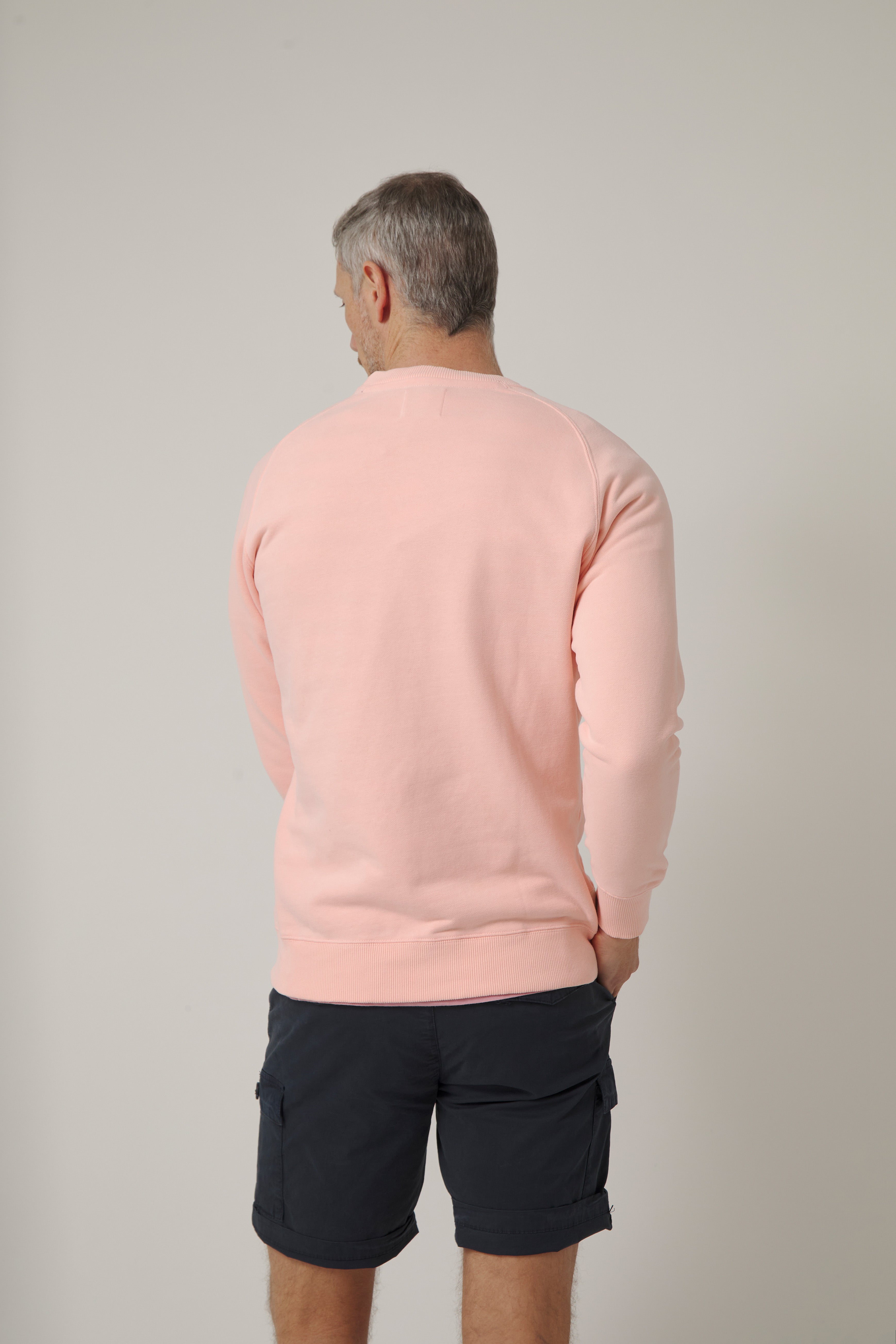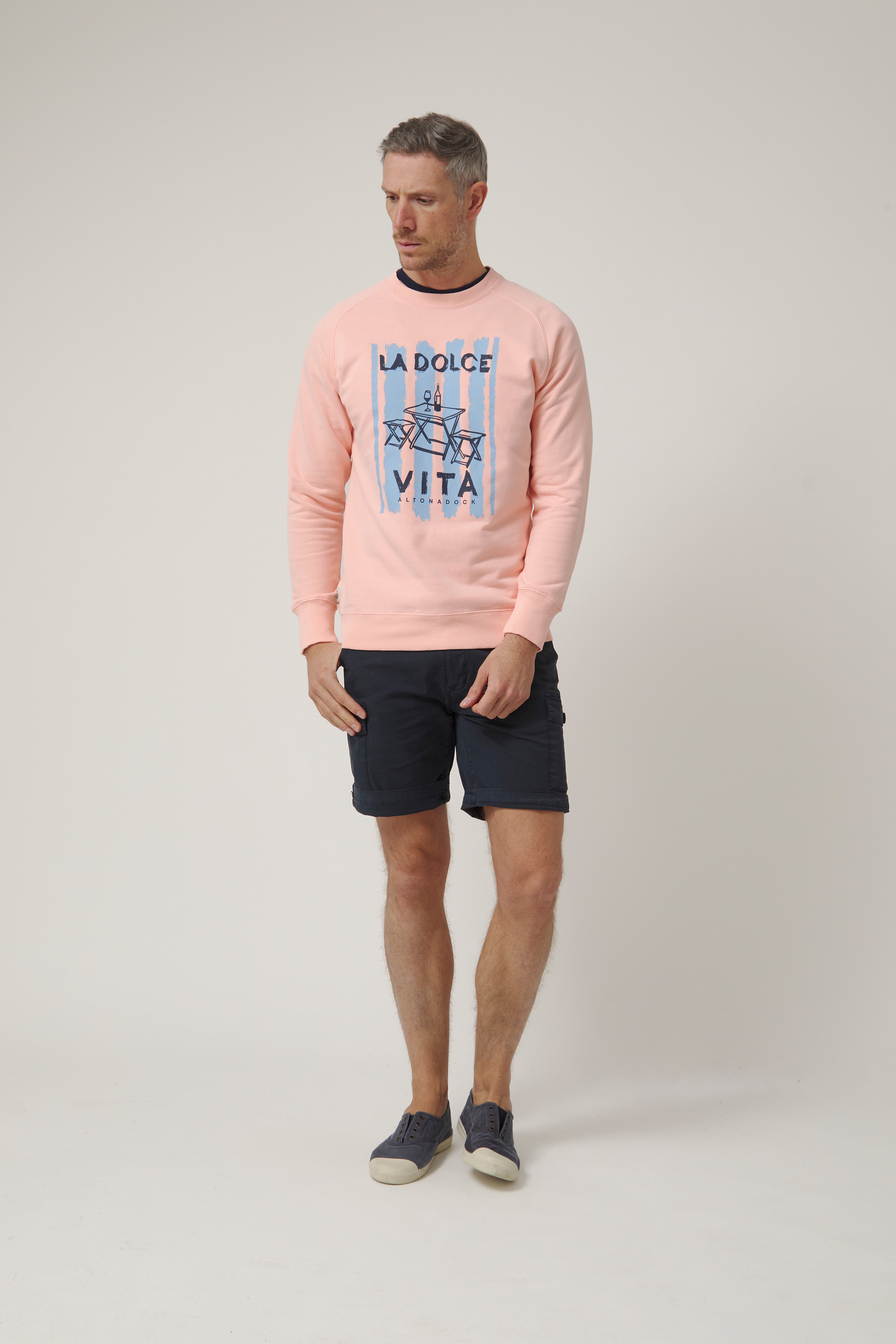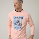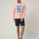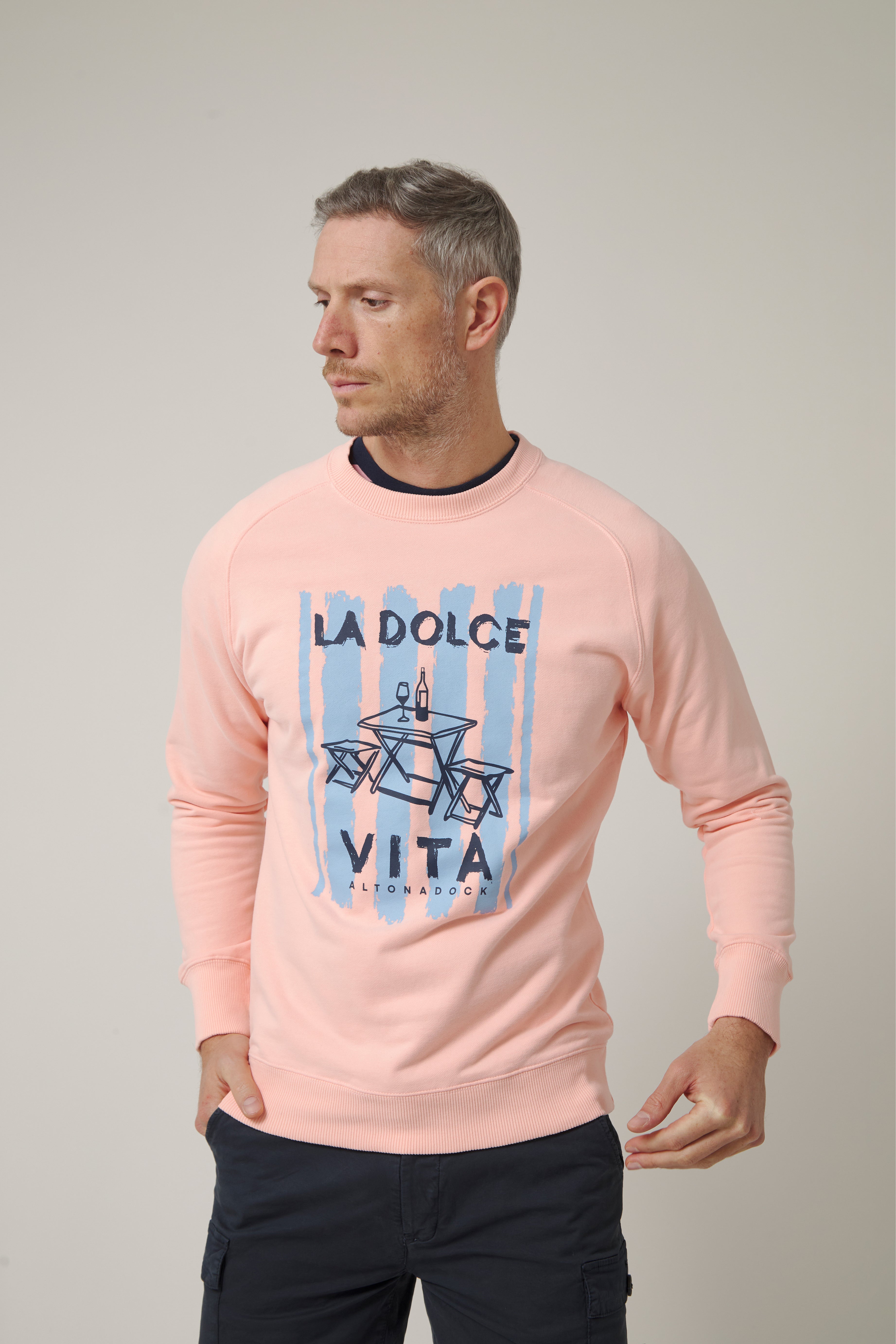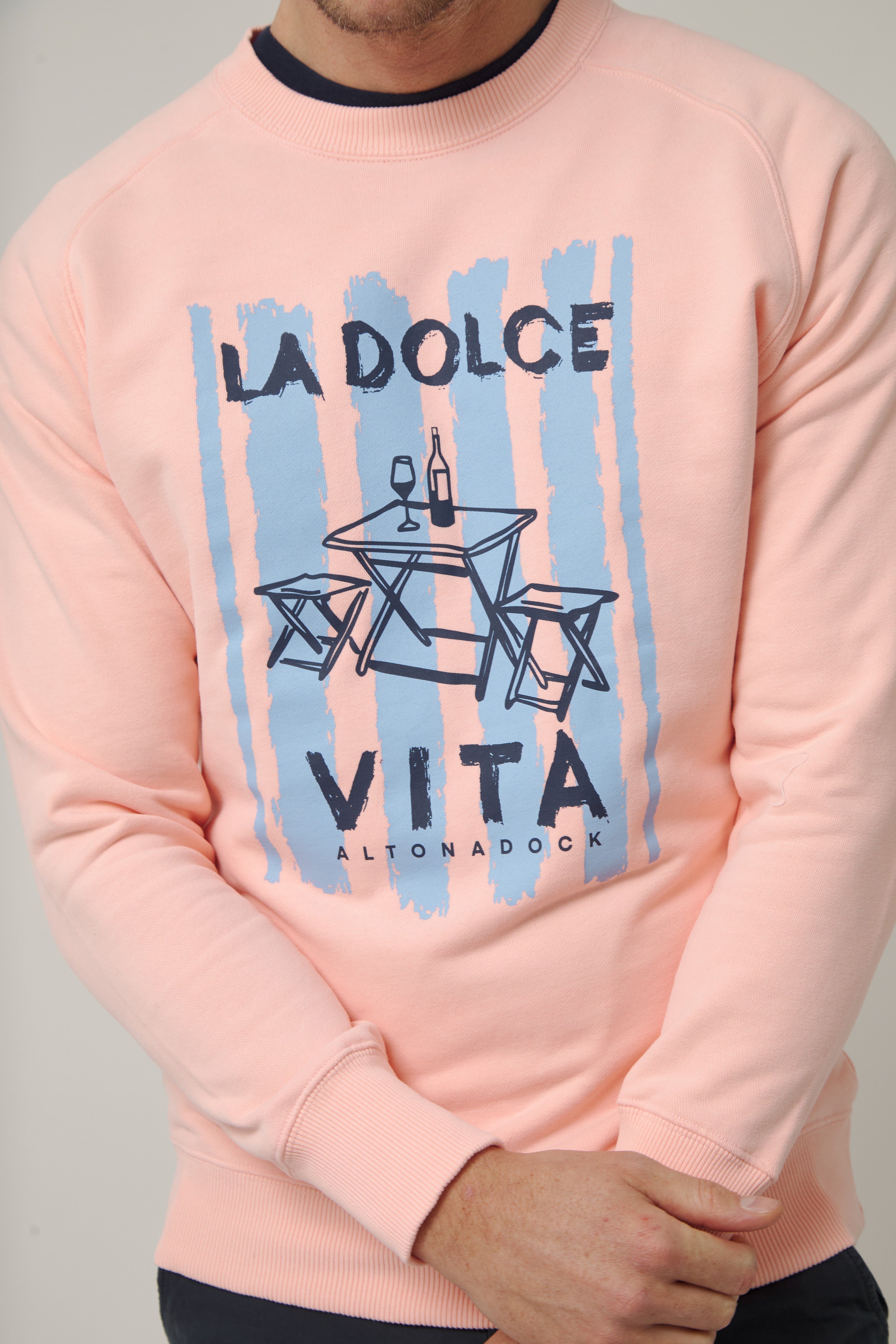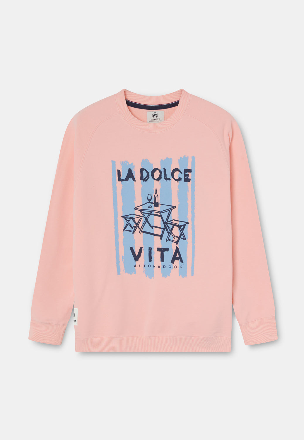 Sudadera de cuello redondo en tono rosa empolvado con gráfico frontal “La Dolce Vita”, acompañado de una ilustración de mesa y sillas dibujadas a línea y enmarcadas por trazos verticales en azul. Un diseño que evoca esos momentos de pausa frente al mar, cuando el tiempo se estira y todo ocurre sin prisa.